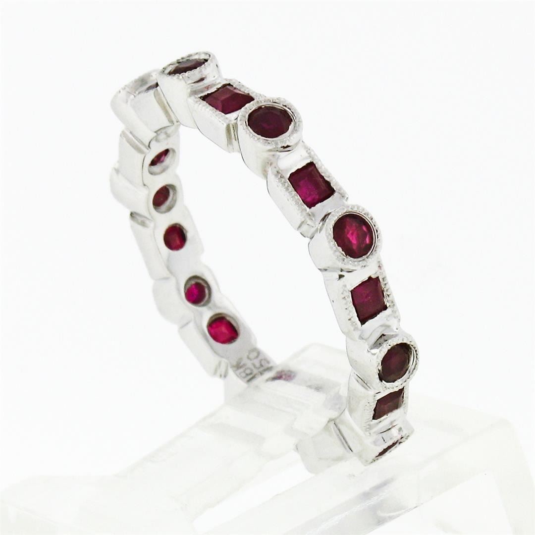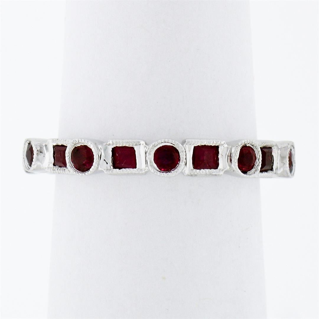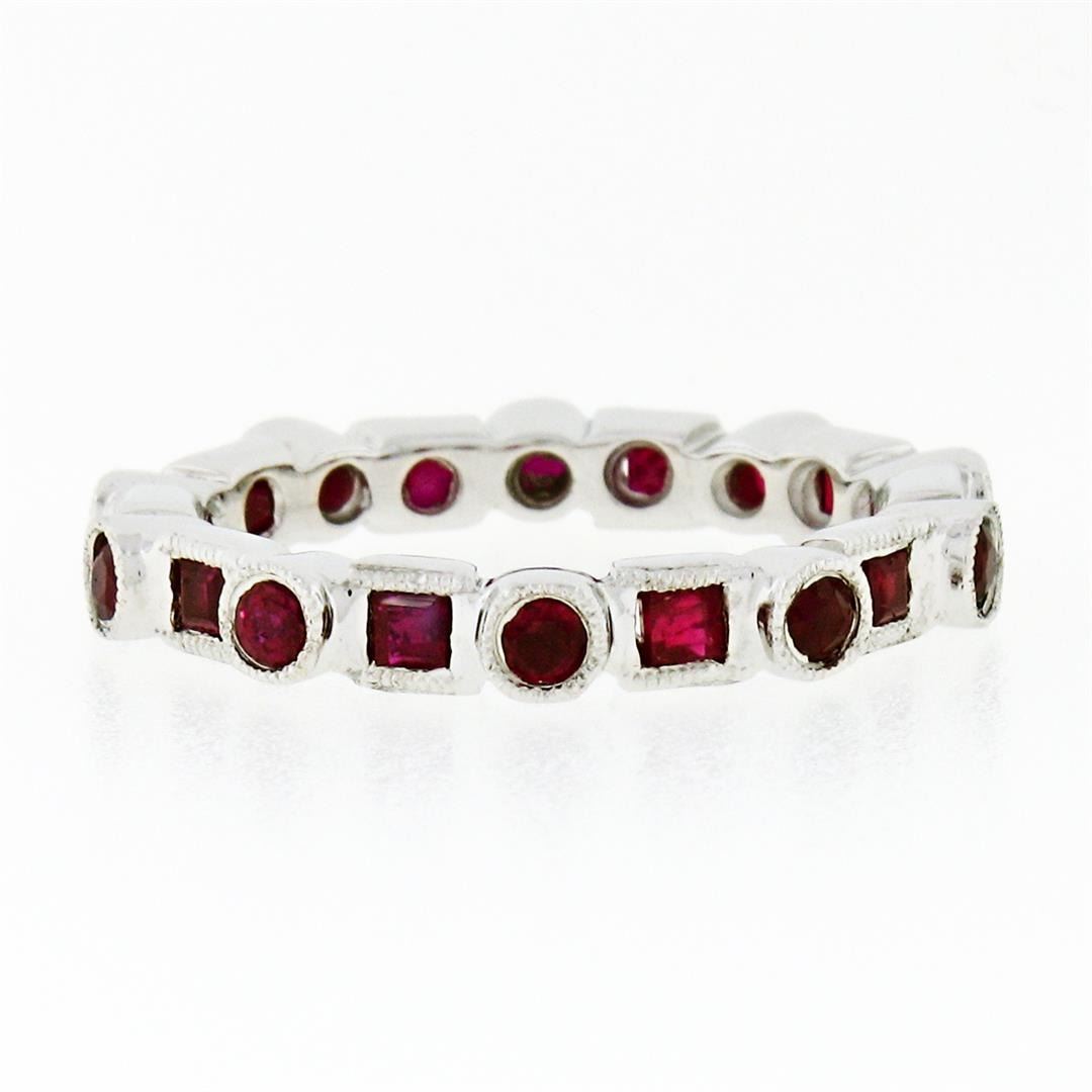 An estate solid 18k white gold eternity band ring, featuring 1.42ctw 10 round brilliant cut natural rubies, alternated with 10 square step cut natural rubies. The ring is size 6.0, weighs a total of 3.76 grams, and measures 3.05mm wide.