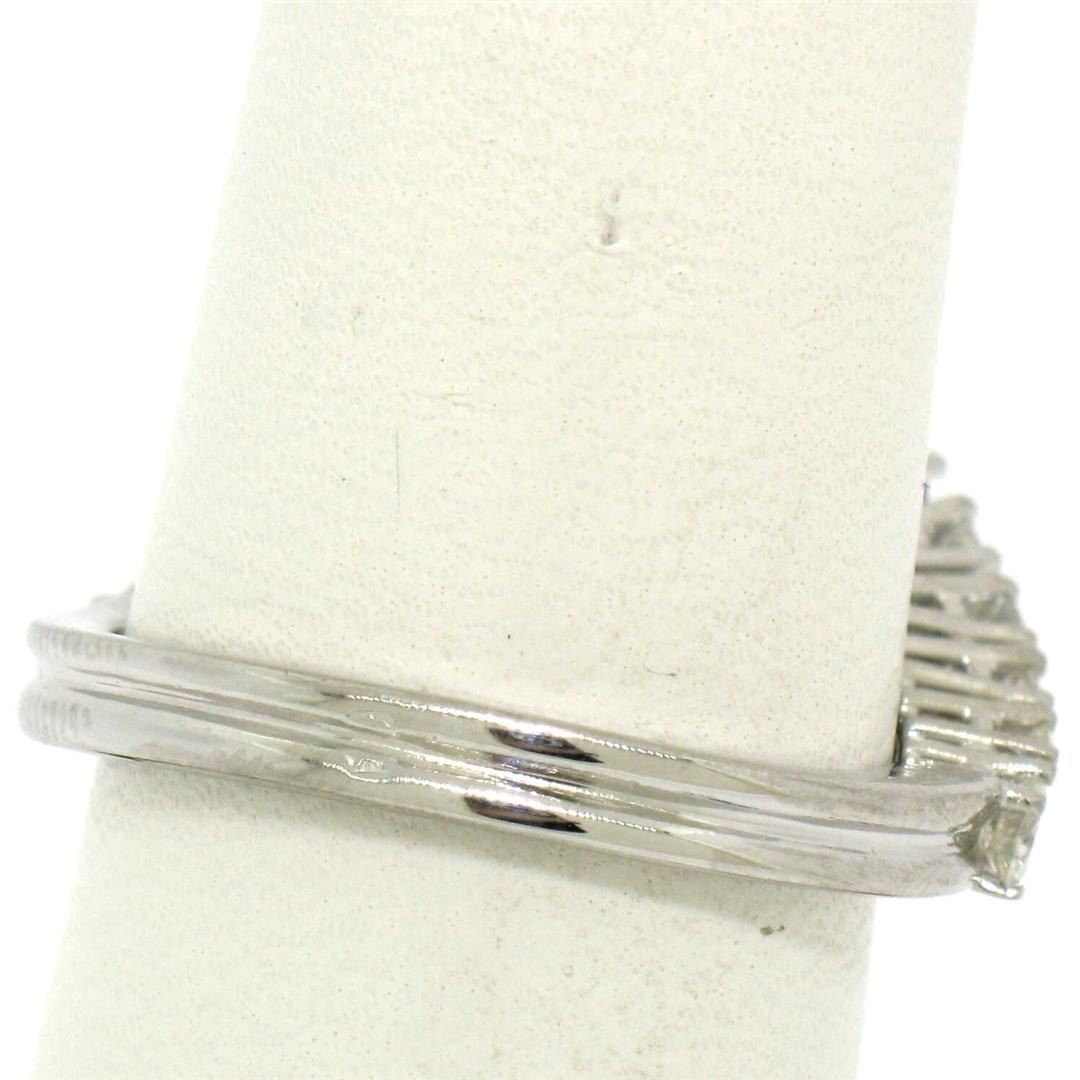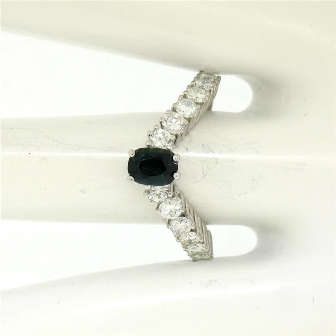 18k White Gold 1.64ctw Oval Sapphire Solitaire Round Diamond Chevron V Band Ring. Please see photos and description for all available information. An estate 18k white gold chevron V band ring, with 1 oval cut natural sapphire (0.56ct ), accented with 12 round brilliant cut natural diamonds (F/G- VS1/VS2; 1.08ctw). The ring is size 6.5, weighs a total of 4.54 grams, and measures 10.85mm wide.
