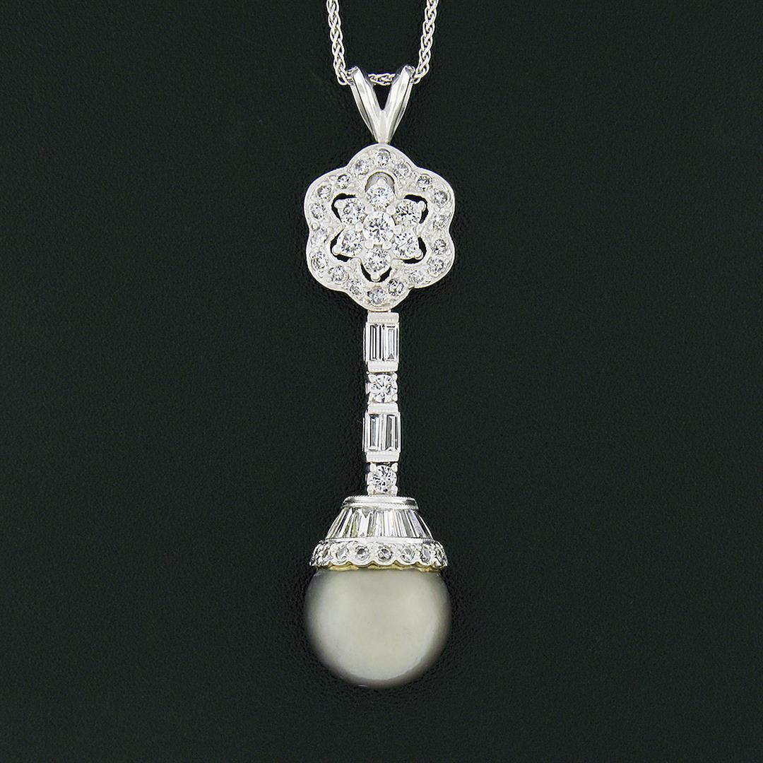 A solid 18k white gold dangle pendant necklace. with 1 round shape Tahitian pearl (11.80mm), and 50 baguette with round brilliant cut natural diamonds (G/H - VS2/SI1 ; 1.84ctw). 14k white gold 18 inch wheat link chain, 9.23 grams total weight, pendant measures 49.80x12.20mm.