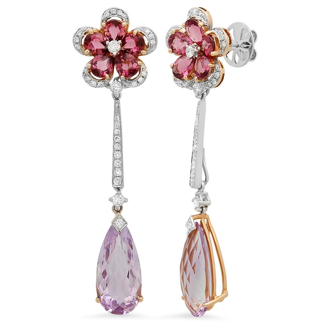 One 18k White Gold 11.73CTW Diamond and Amethys and Tourmaline Earring, (SI1-SI2/G-H) - Product Specification: Stone: Diamond Stone 2: Amethys Stone 2 Weight: 8.4 Stone 3: 10 Stone 3 Custom: Women Stone 3 Weight: 2.77 Stone 4 Custom: SI1-SI2 / G-H Stone Clarity: SI1-SI2 Stone Color: G-H Stone Weight: 0.56 Weight: 1 Width: 15.0mm
