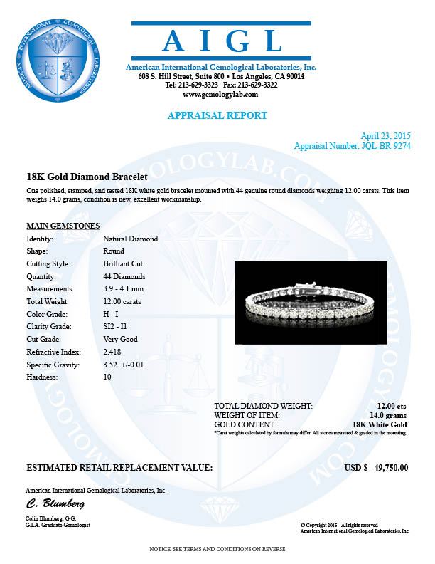 Retail: $49,600.00 ****** 18k White Gold 12.00ct Diamond Tennis Bracelet ****** Metal: 18k Solid White Gold / Size: 7.5 / Total Item Weight: 14.0 grams / Country Made: United States / / Main Stone: Diamond / Color: White / Carat Total Weight: 12.00 / Treatment: None / Color Grade: H - I / Clarity: SI2 - I1 / Cut: Very Good /