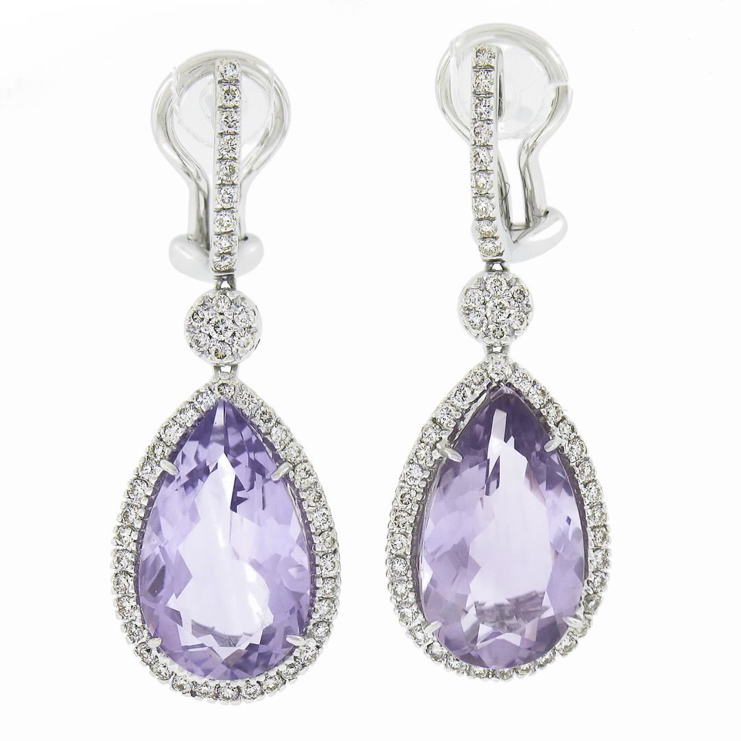 A solid 18k white gold drop dangle earrings, with 2 pear cut natural amethyst (12ctw), and 100 round cut natrual diamonds (G-I - VS1/VS2 ; 0.50ctw). The earrings measure approximately 35.2x12.9mm and weigh a total of 9.59 grams.