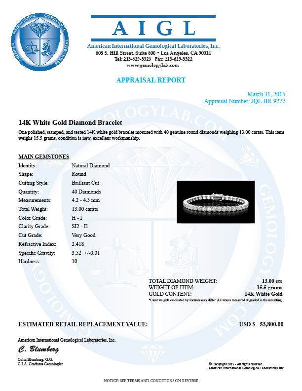 Retail: $53,800.00 ****** 18k White Gold 13.00ct Diamond Tennis Bracelet ****** Metal: 18k Solid White Gold / Size: 7 / Total Item Weight: 15.5 grams / Country Made: United States / / Main Stone: Diamond / Color: White / Carat Total Weight: 13.00 / Treatment: None / Color Grade: H - I / Clarity: SI2 - I1 / Cut: Very Good /