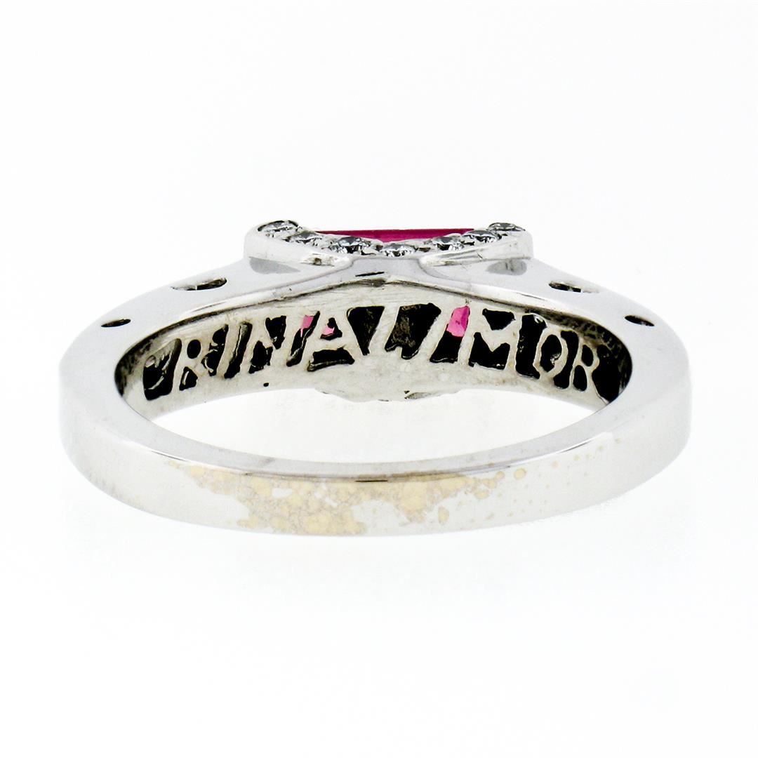 An estate solid 18k white gold sideways solitaire ring, with 1 emerald cut natural tourmaline (1.55ctw), and 26 round brilliant cut natural diamonds (G/H - VS1/VS2 ; 0.50ctw). The ring is size 7.5, weighs a total of 5.35 grams, and measures 5.78mm wide.