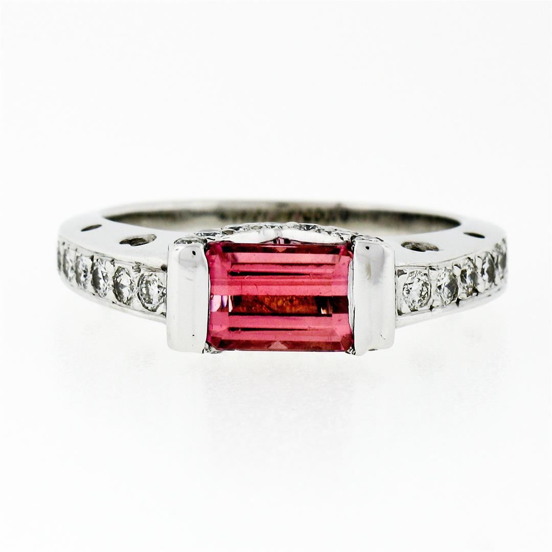 An estate solid 18k white gold sideways solitaire ring, with 1 emerald cut natural tourmaline (1.55ctw), and 26 round brilliant cut natural diamonds (G/H - VS1/VS2 ; 0.50ctw). The ring is size 7.5, weighs a total of 5.35 grams, and measures 5.78mm wide.
