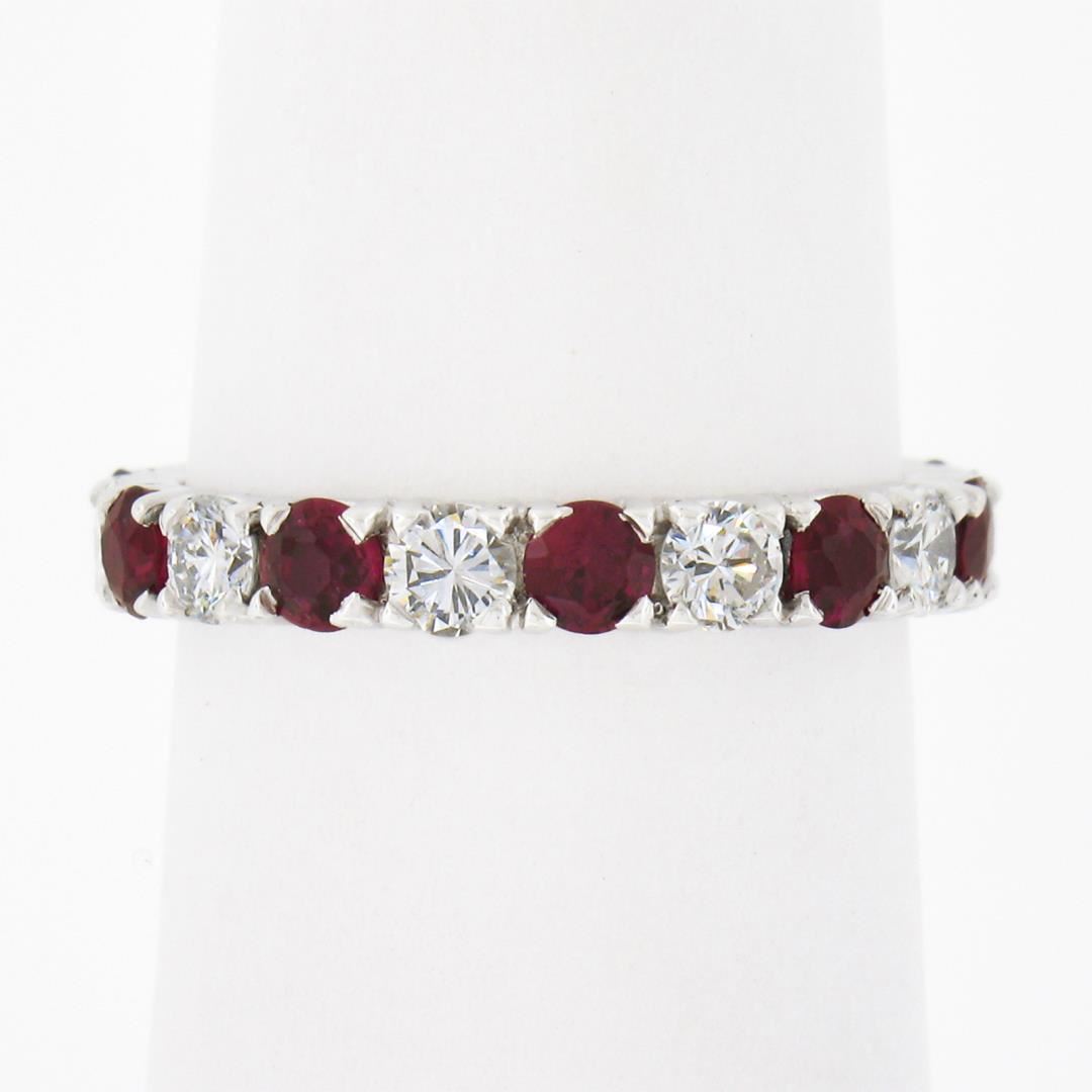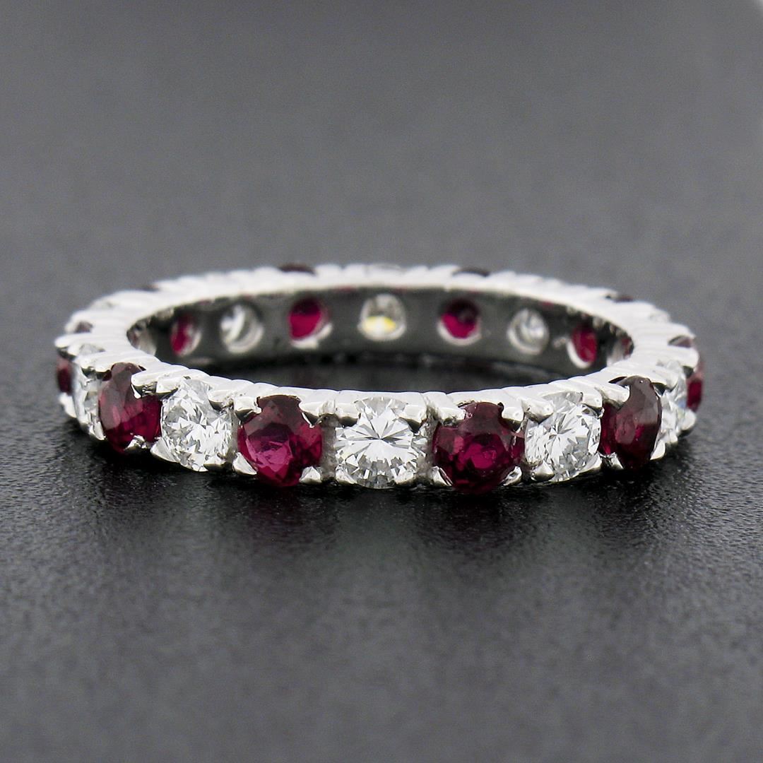 A vintage solid 18k white gold eternity band ring, with alternated 10 round brilliant cut natural rubies (1.30ctw), and 10 round brilliant cut natural diamonds (G/H - VS1/VS2 ; 0.80ctw). The ring is size 5.5, weighs a total of 2.57 grams, and measures 3mm wide.