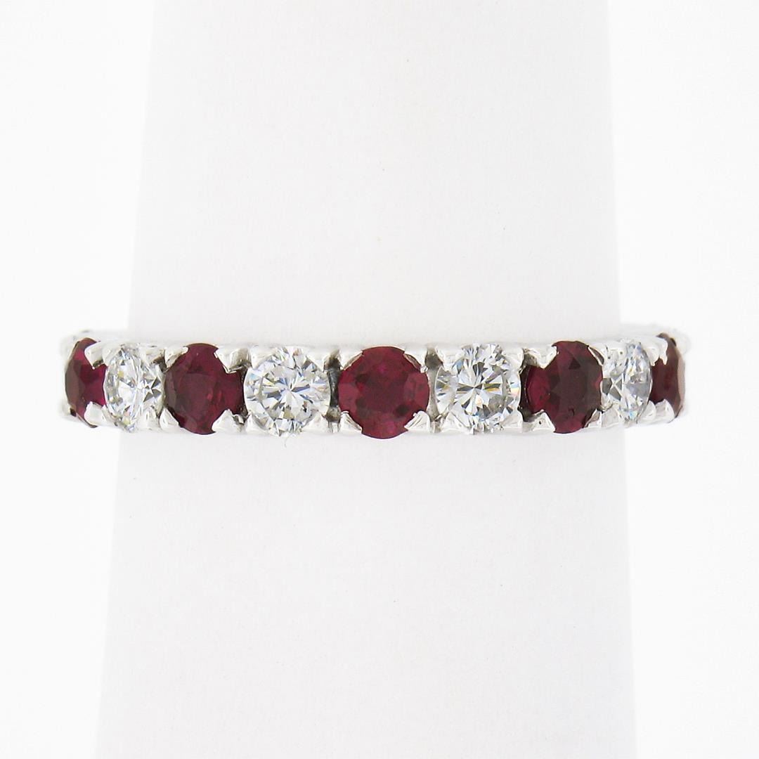 A vintage solid 18k white gold eternity band ring, with alternated 10 round brilliant cut natural rubies (1.30ctw), and 10 round brilliant cut natural diamonds (G/H - VS1/VS2 ; 0.80ctw). The ring is size 5.5, weighs a total of 2.57 grams, and measures 3mm wide.