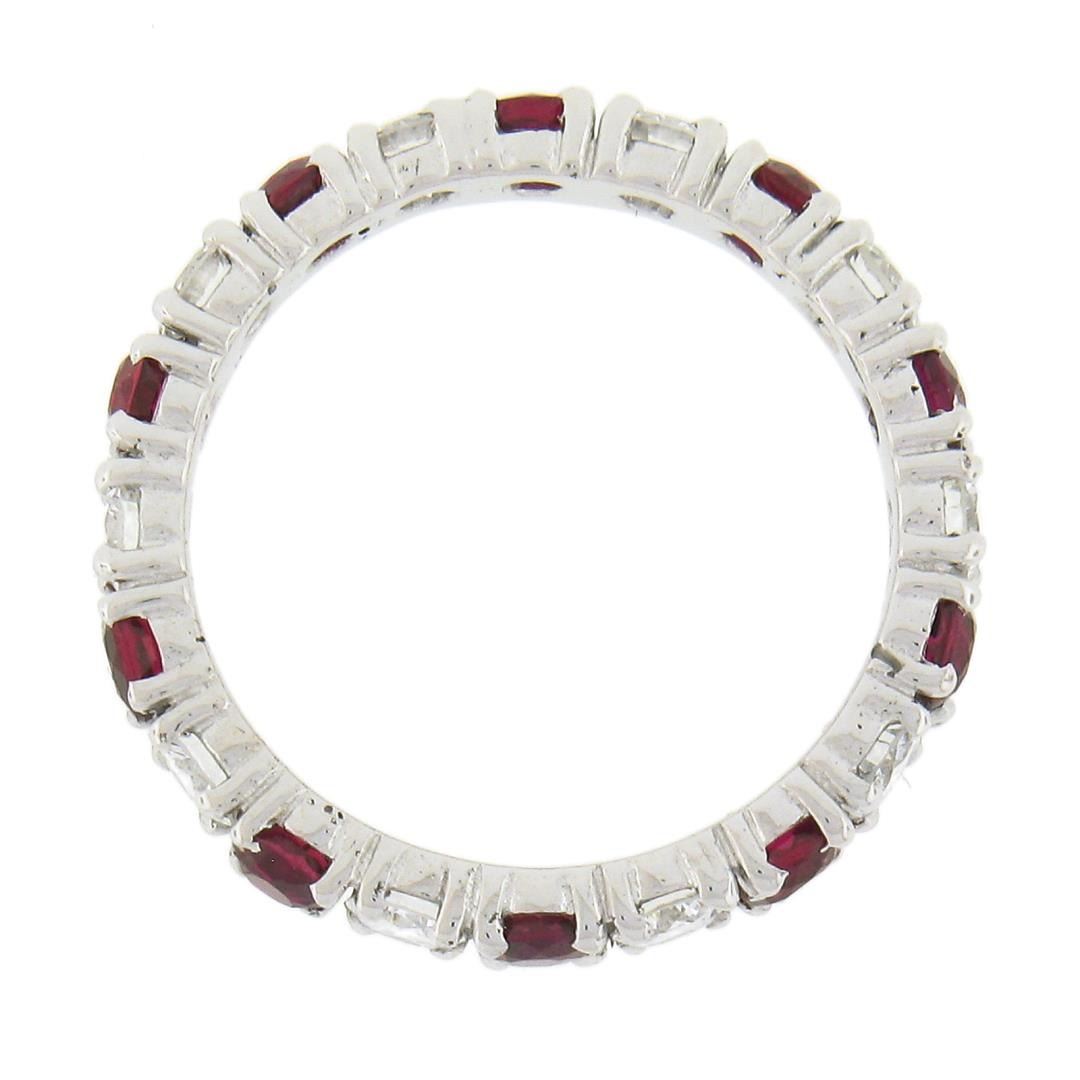 A vintage solid 18k white gold eternity band ring, with alternated 10 round brilliant cut natural rubies (1.30ctw), and 10 round brilliant cut natural diamonds (G/H - VS1/VS2 ; 0.80ctw). The ring is size 5.5, weighs a total of 2.57 grams, and measures 3mm wide.