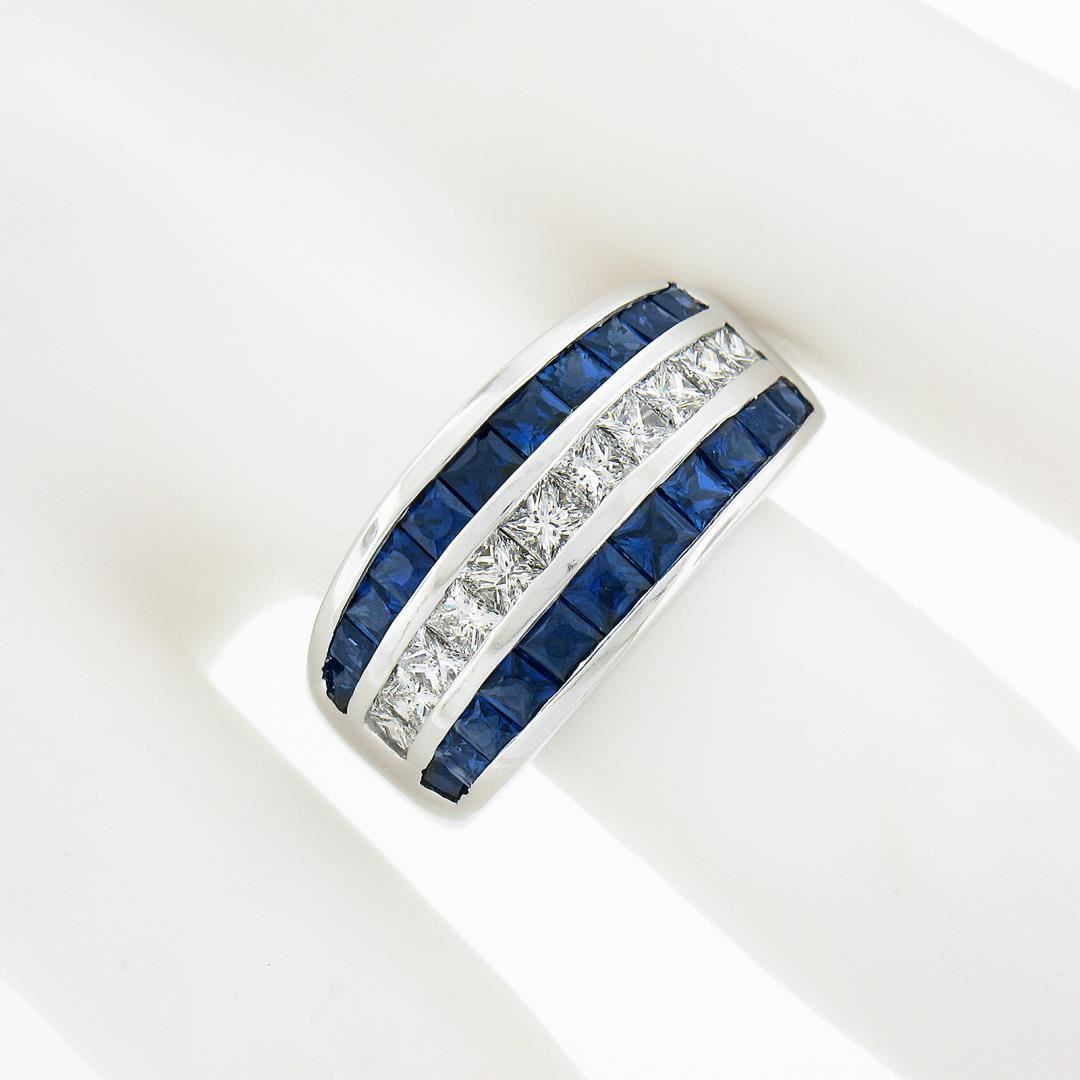 A solid 18k white gold band ring, with 11 princess cut natural diamonds (F/G - VS1/VS2 ; 1.0ctw), and 22 Square cut natural sapphires ( 2.20ctw ). The ring is size 7.5, weighs a total of 12.32 grams, and measures 10.8mm wide.