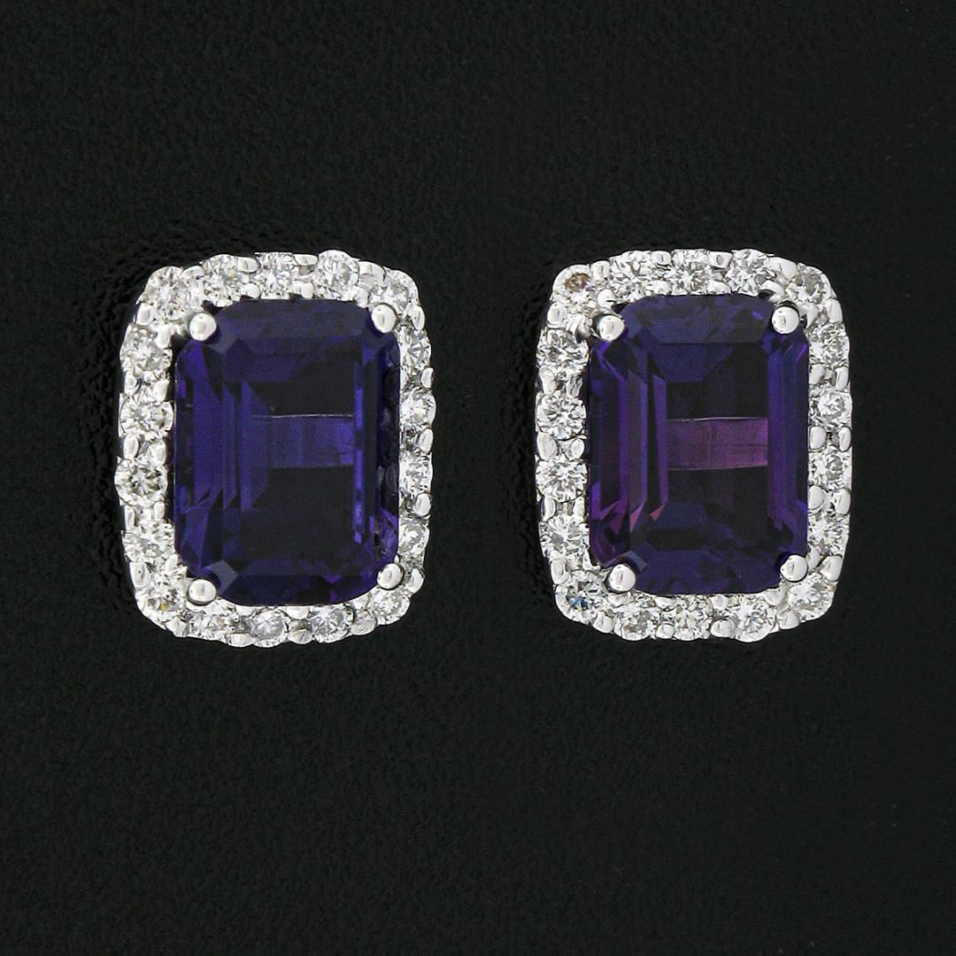 A solid 18k white gold pair of stud earrings, with 2 rectangular cut natural amethyst (3.0ctw ), surrouned with a halo of 38 round cut natural diamonds (F/G - VS1/VS2 ; 0.38ctw).The earrings measure approximately 10.50x8.70mm and weigh a total of 4.11 grams.
