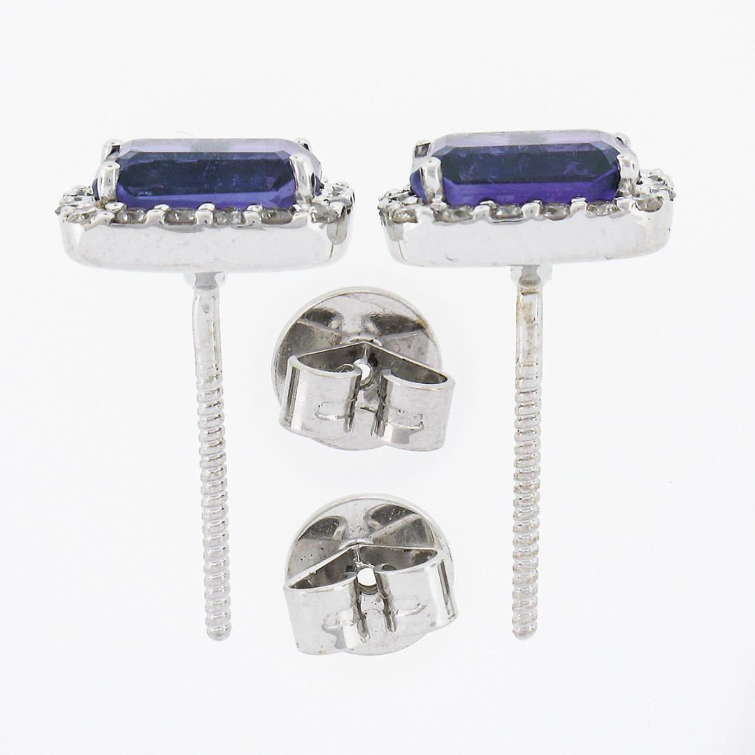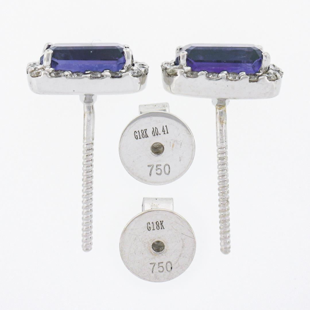 A solid 18k white gold pair of stud earrings, with 2 rectangular cut natural amethyst (3.0ctw ), surrouned with a halo of 38 round cut natural diamonds (F/G - VS1/VS2 ; 0.38ctw).The earrings measure approximately 10.50x8.70mm and weigh a total of 4.11 grams.
