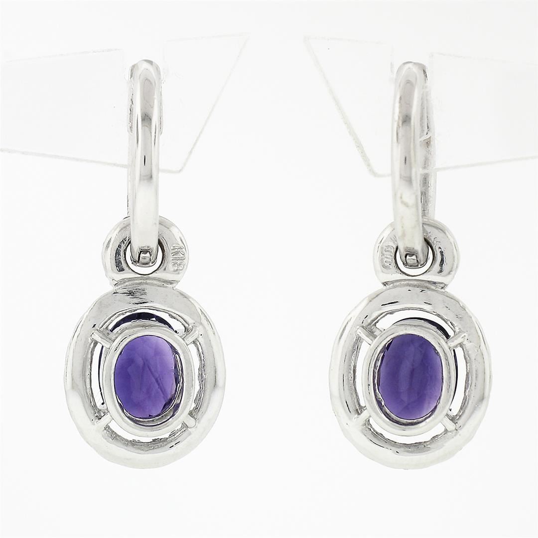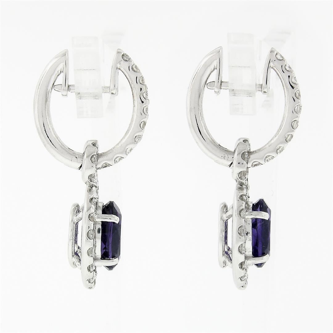 A solid 18k white gold dangle drop earrings, featuring 2 oval cut natural amethysts (7.85x5.95mm - 2.40ct), and 72 round brilliant cut natural diamonds (F/G - VS1/VS2; 1.40ct). The earrings measure approximately 27.75x11mm and weigh a total of 6.84 grams.