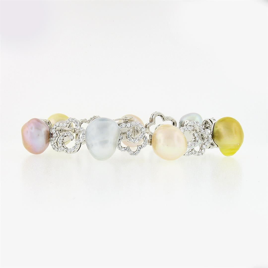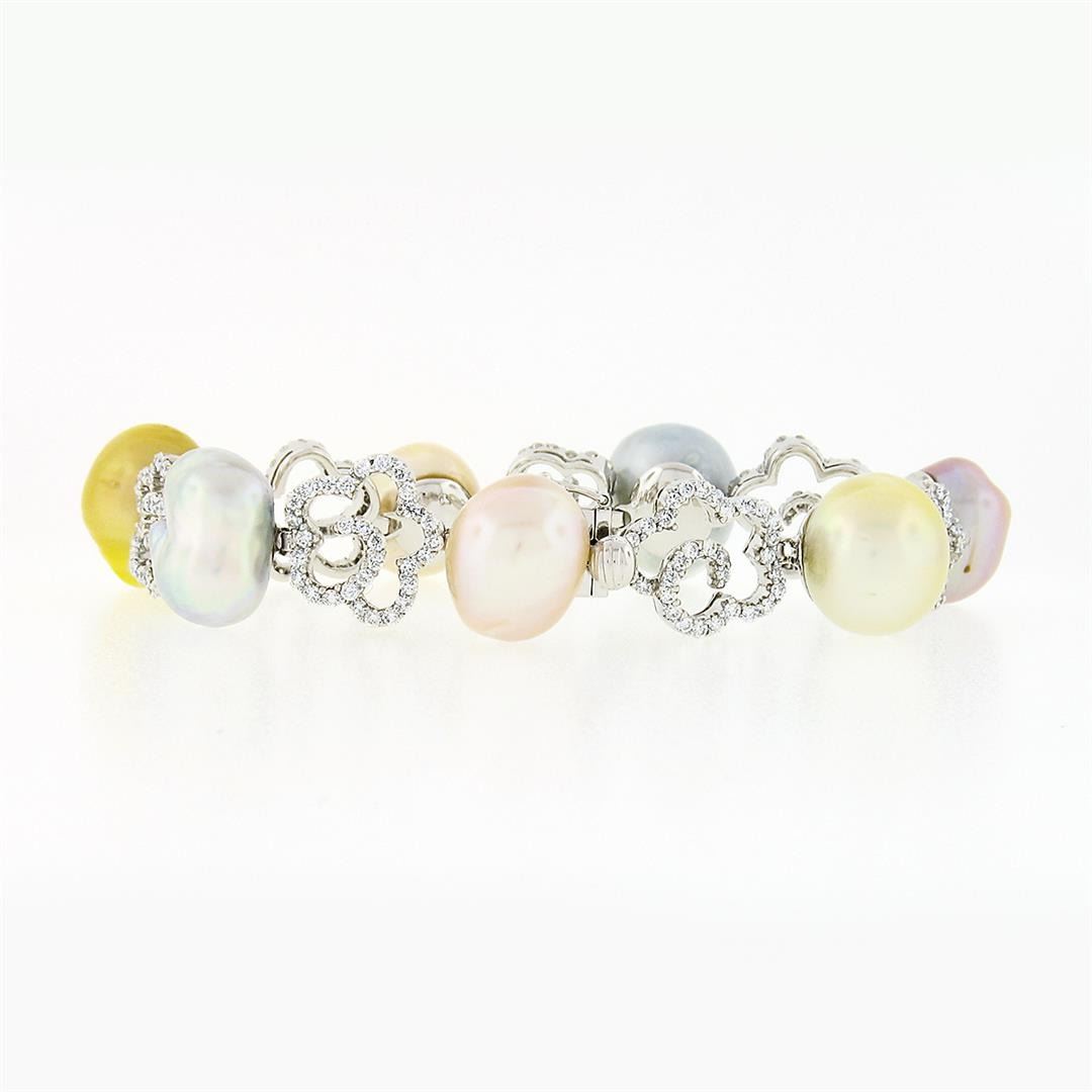 A solid 18k white gold bracelet, featuring 7 multi color baroque shape natural south sea pearls, & 201 round brilliant cut natural diamonds (VS1/VS2 ; E/F - 3.0ctw). It weighs a total of 37.64 grams, and measures 6.25 inches in length.