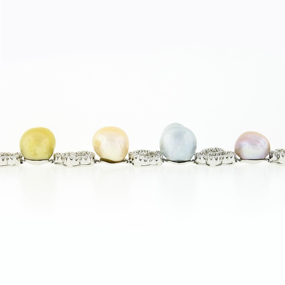 A solid 18k white gold bracelet, featuring 7 multi color baroque shape natural south sea pearls, & 201 round brilliant cut natural diamonds (VS1/VS2 ; E/F - 3.0ctw). It weighs a total of 37.64 grams, and measures 6.25 inches in length.