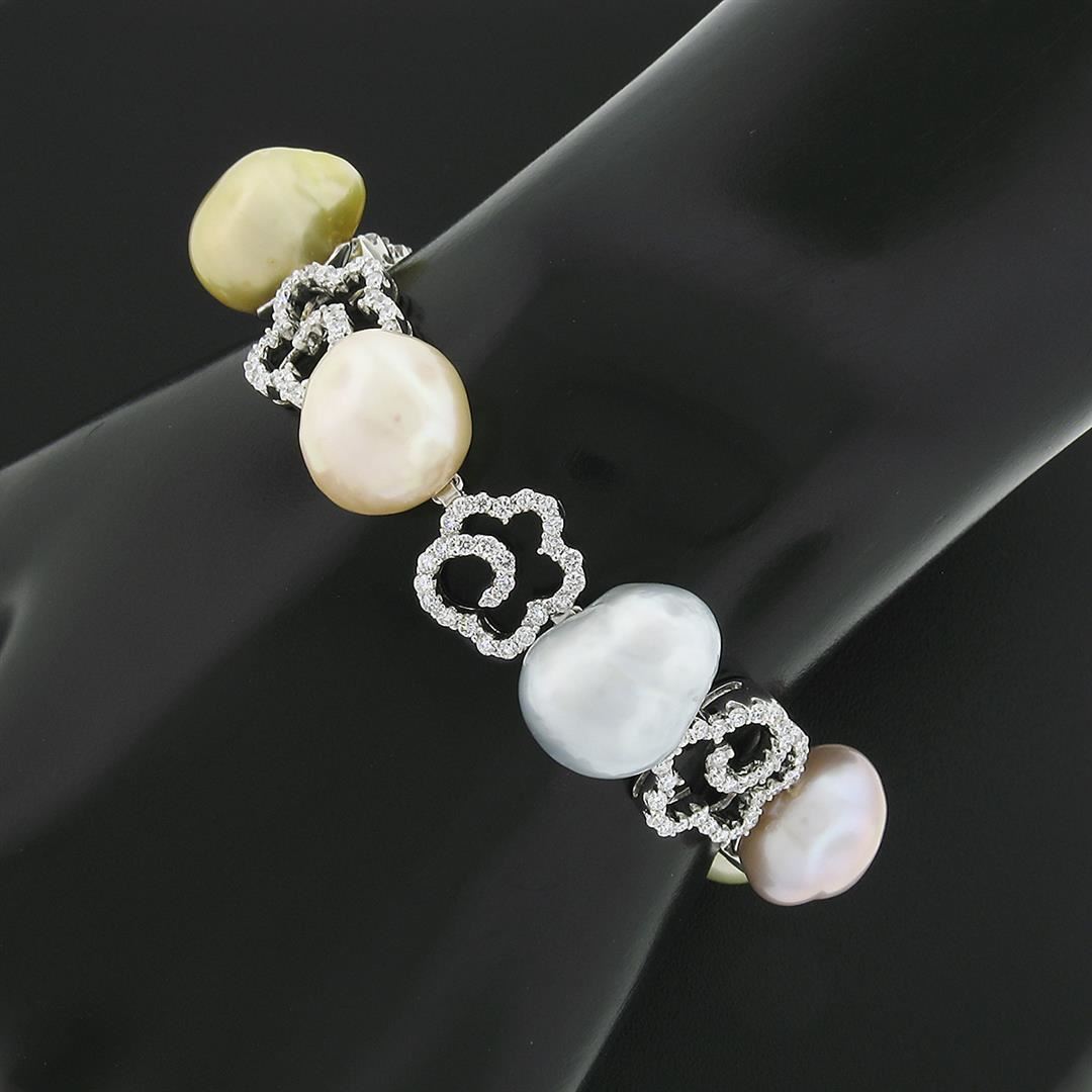 A solid 18k white gold bracelet, featuring 7 multi color baroque shape natural south sea pearls, & 201 round brilliant cut natural diamonds (VS1/VS2 ; E/F - 3.0ctw). It weighs a total of 37.64 grams, and measures 6.25 inches in length.