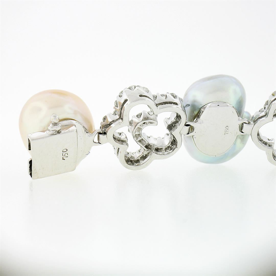 A solid 18k white gold bracelet, featuring 7 multi color baroque shape natural south sea pearls, & 201 round brilliant cut natural diamonds (VS1/VS2 ; E/F - 3.0ctw). It weighs a total of 37.64 grams, and measures 6.25 inches in length.