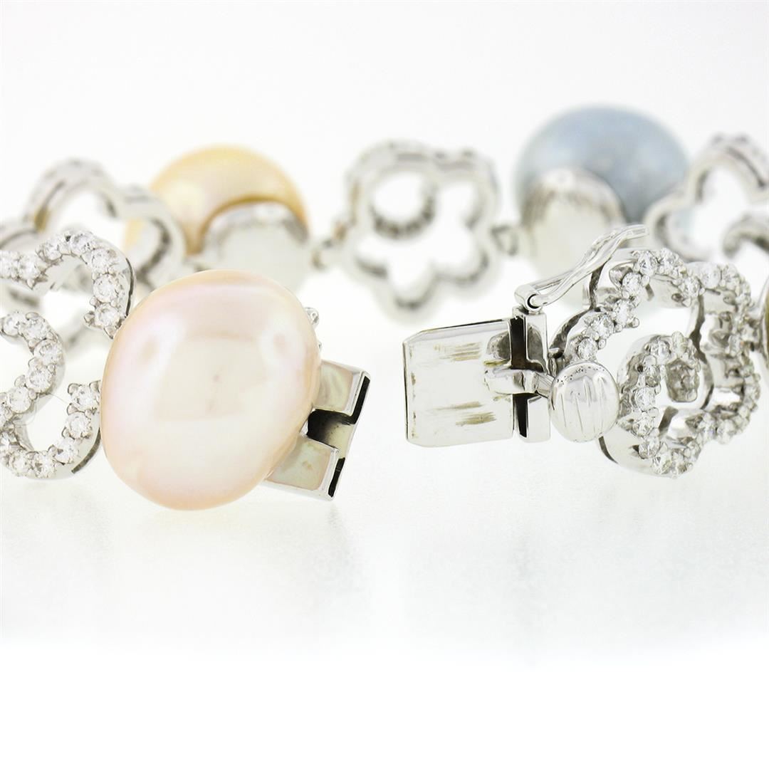 A solid 18k white gold bracelet, featuring 7 multi color baroque shape natural south sea pearls, & 201 round brilliant cut natural diamonds (VS1/VS2 ; E/F - 3.0ctw). It weighs a total of 37.64 grams, and measures 6.25 inches in length.