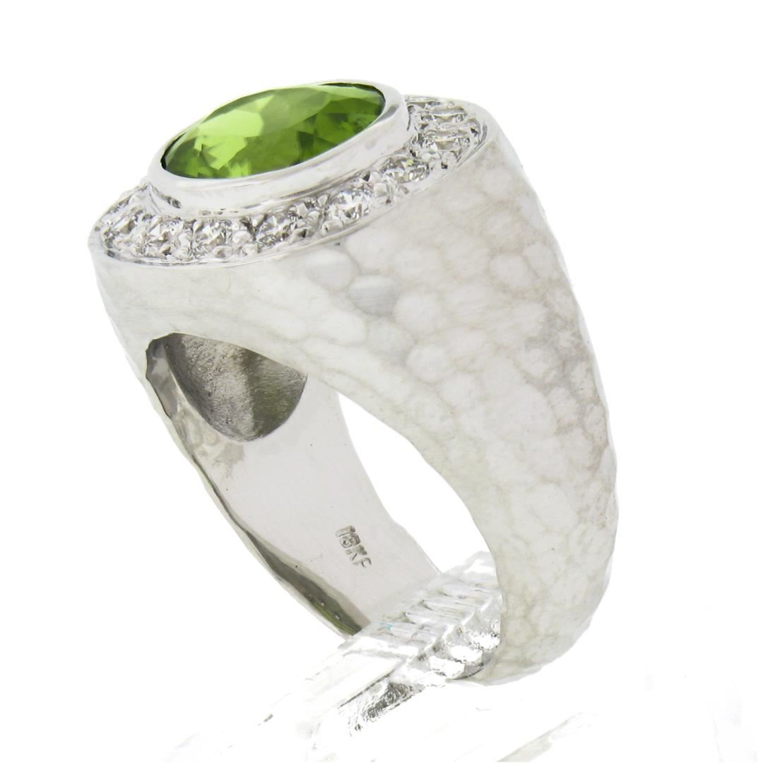 A solid 18k white gold ring, with 1 oval cut natural peridot (11x8.5mm / 3.62ct), and 14 round brilliant cut natural diamonds ( G/H - VS1/VS2 ; 0.49ctw). The ring is size 7.0, weighs a total of 13.07 grams, and measures 14.5mm wide.