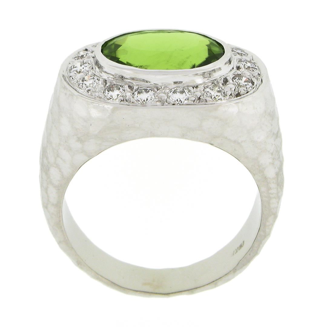 A solid 18k white gold ring, with 1 oval cut natural peridot (11x8.5mm / 3.62ct), and 14 round brilliant cut natural diamonds ( G/H - VS1/VS2 ; 0.49ctw). The ring is size 7.0, weighs a total of 13.07 grams, and measures 14.5mm wide.