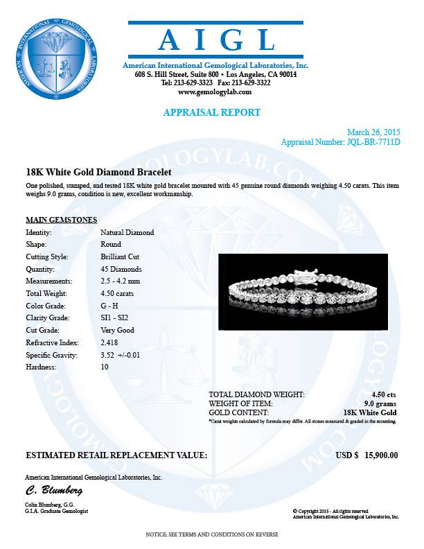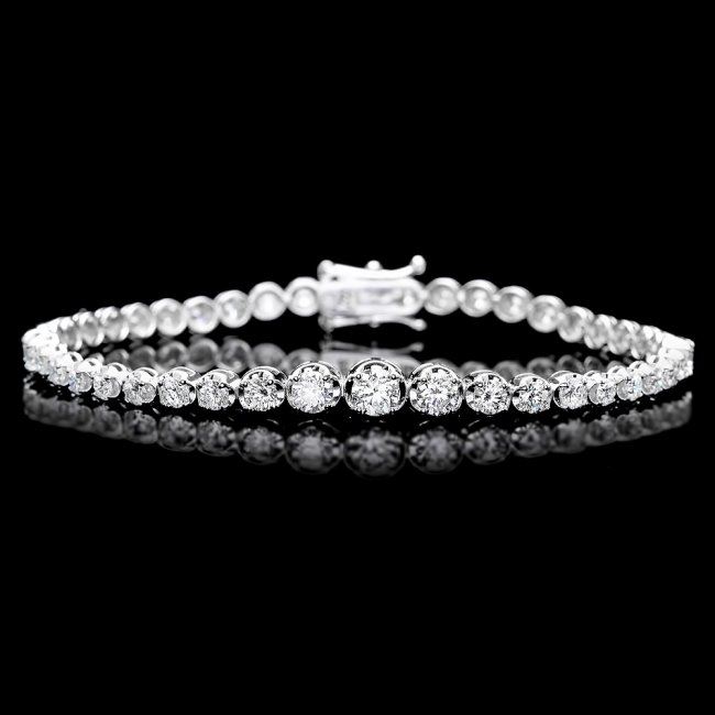 Retail: $15,900.00 ****** 18k White Gold 4.50ct Diamond Bracelet ****** Metal: 18k Solid White Gold / Size: 7 / Total Item Weight: 9.0 grams / Country Made: United States / / Main Stone: Diamond / Color: White / Carat Total Weight: 4.50 / Treatment: None / Color Grade: G - H / Clarity: SI1 - SI2 / Cut: Very Good /