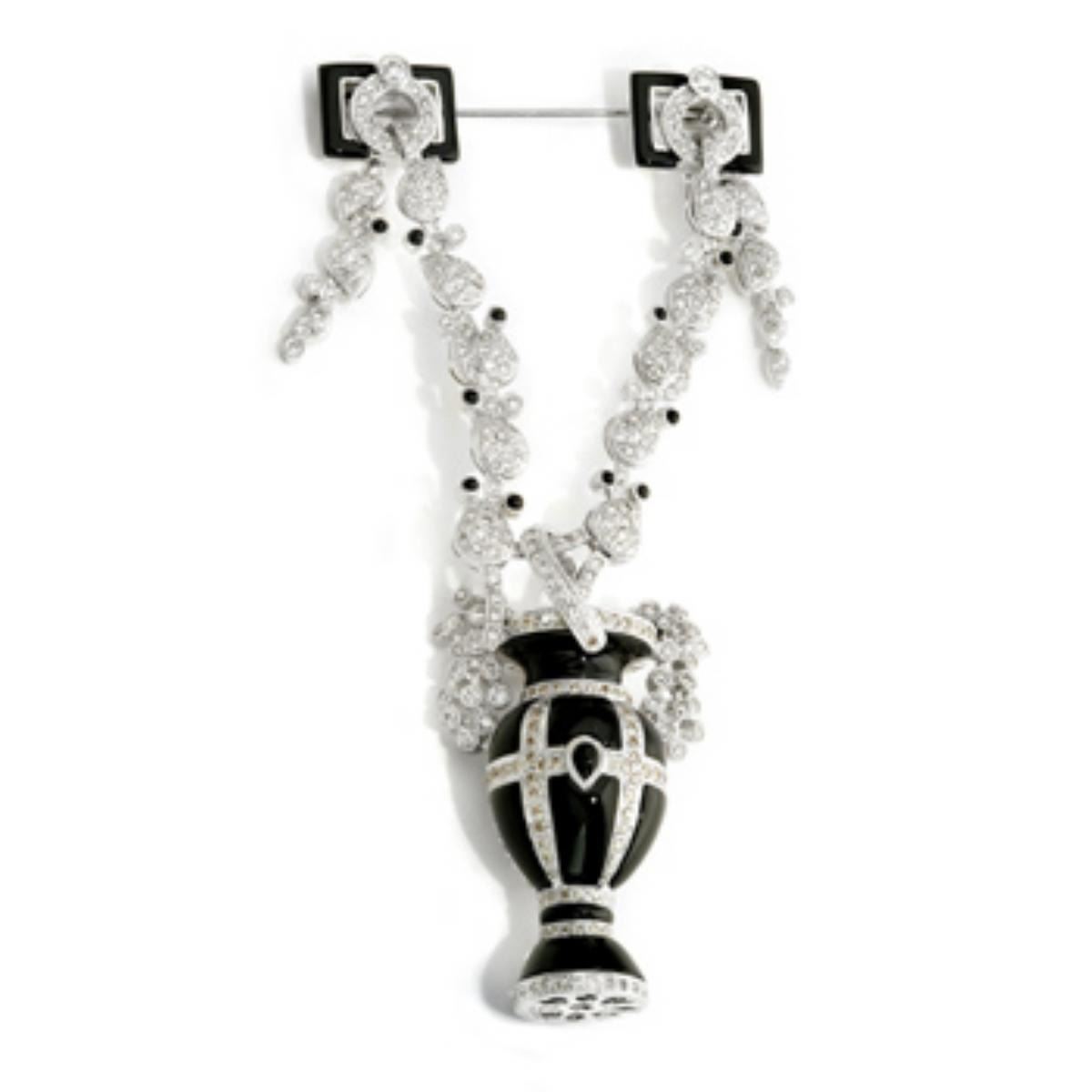One 18k White Gold 5.02CTW Onyx and Diamond Pin, (I1-I2/G-H) - Product Specification:  Stone: Onyx Stone 2 Clarity: I1-I2 Stone 2 Color: G-H Stone 2 Shape: Round Stone 2 Type: Diamond Stone 2 Weight: 5.02 Stone 3 Custom: Women Weight: 1 Width: 50.8mm