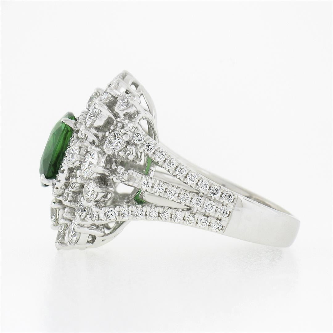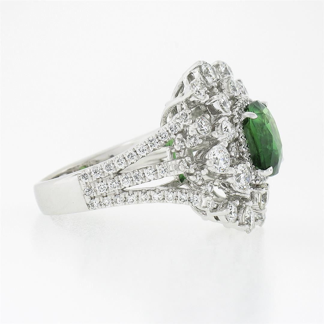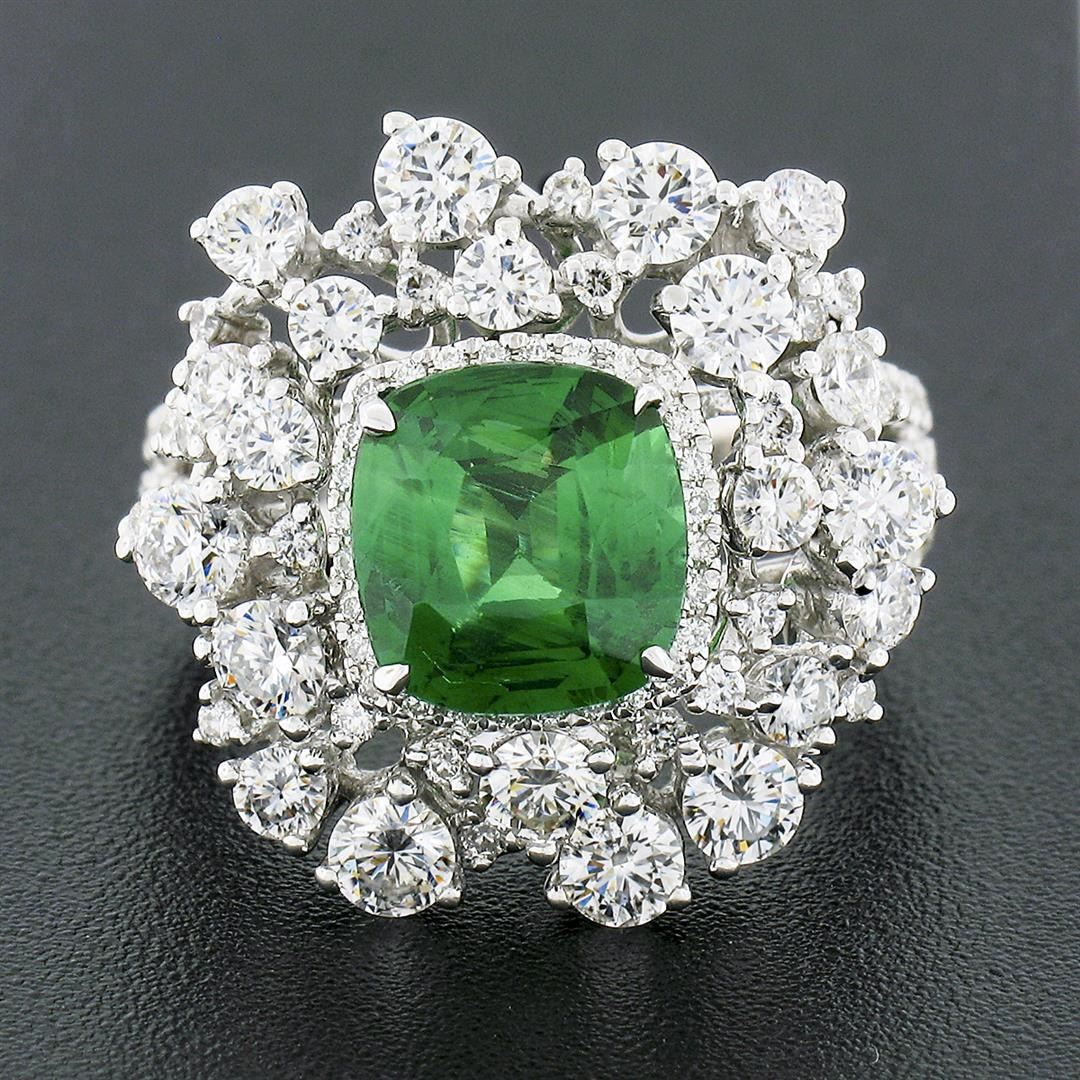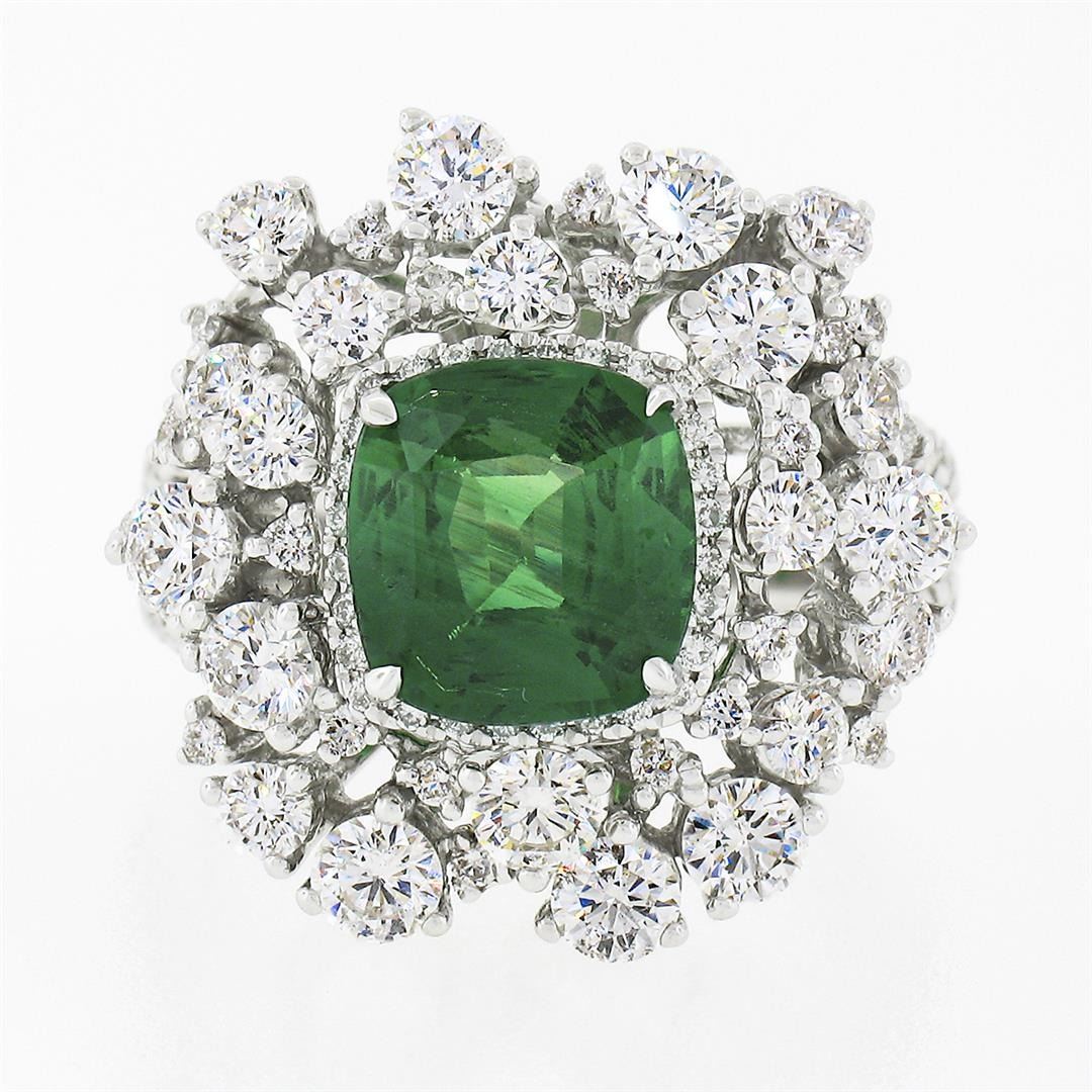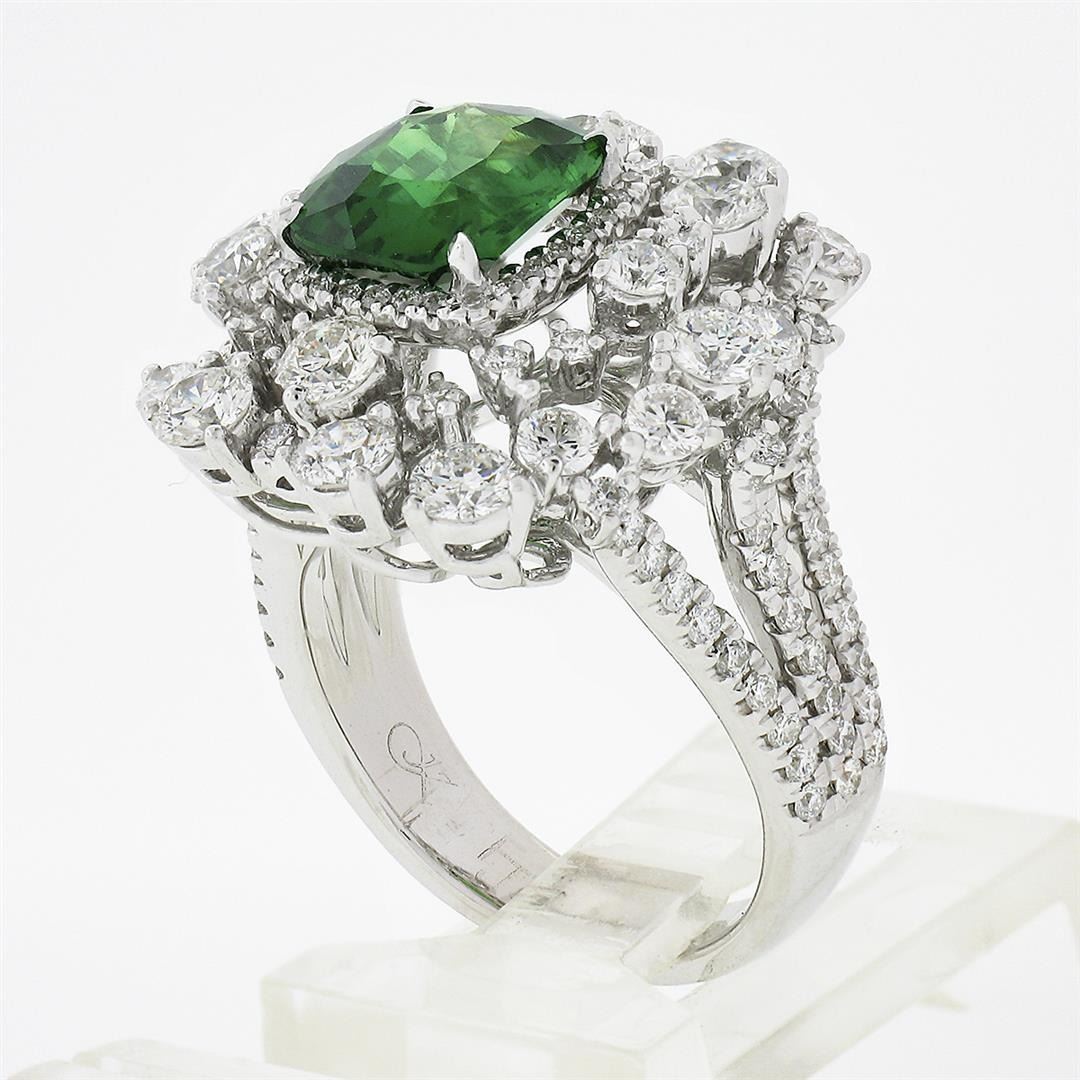 A solid 18k white gold cocktail ring, with 1 Gia certified cushion cut natural tsavorite (2.64ct), and 130 round brilliant cut natural diamonds (G/H - VS1/VS2 ; 3.03ctw). The ring is size 6.0, weighs a total of 10.97 grams, and measures 20mm wide. Comes with all original relevant certifications.