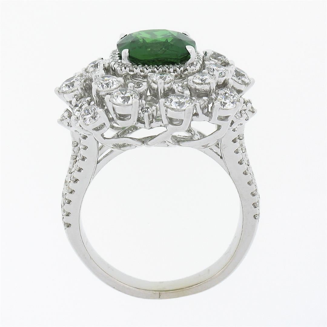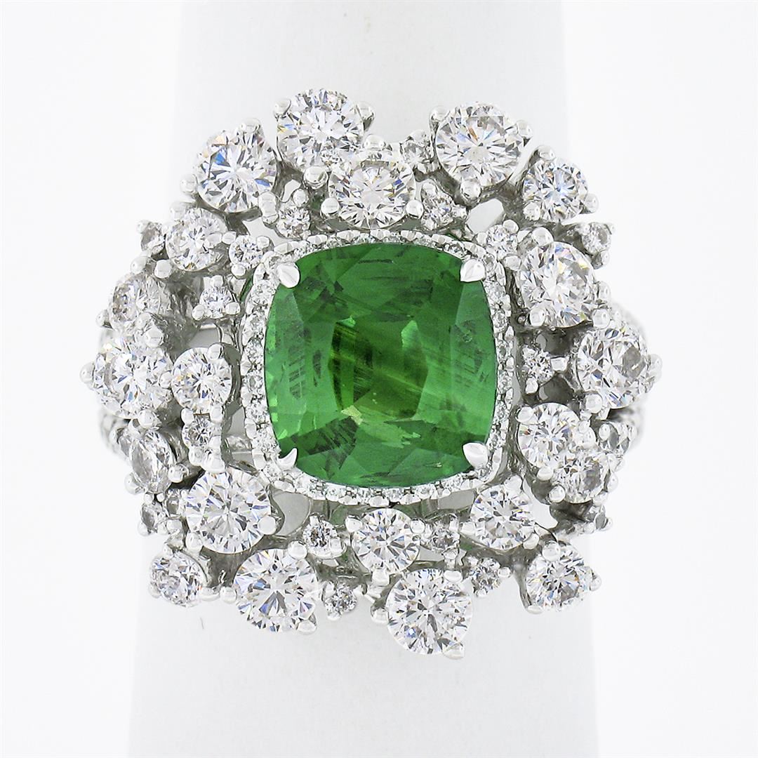 A solid 18k white gold cocktail ring, with 1 Gia certified cushion cut natural tsavorite (2.64ct), and 130 round brilliant cut natural diamonds (G/H - VS1/VS2 ; 3.03ctw). The ring is size 6.0, weighs a total of 10.97 grams, and measures 20mm wide. Comes with all original relevant certifications.