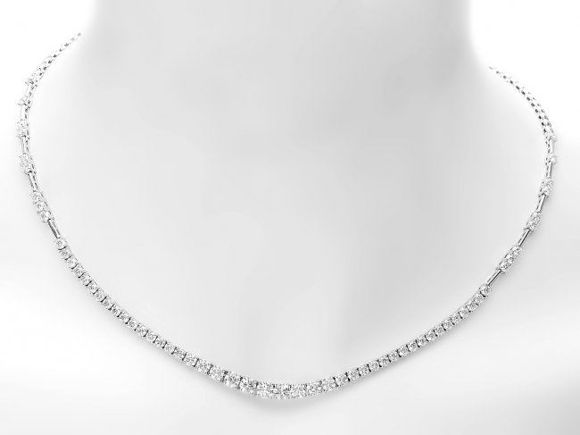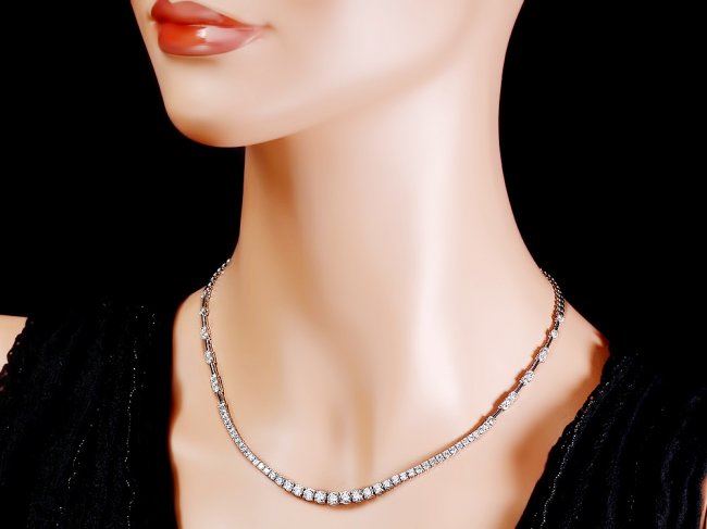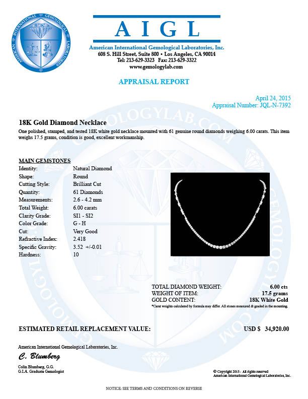 Retail: $34,800.00 ****** 18k White Gold 6.00ct Diamond Necklace ****** Metal: 18k Solid White Gold / Size: 16.5 / Total Item Weight: 17.5 grams / Country Made: United States / / Main Stone: Diamond / Color: White / Carat Total Weight: 6.00 / Treatment: None / Color Grade: G - H / Clarity: SI1 - SI2 / Cut: Very Good /