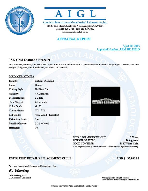 Retail: $37,800.00 ****** 18k White Gold 6.25ct Diamond Bracelet ****** Metal: 18k Solid White Gold / Size: 7 / Total Item Weight: 10.0 grams / Country Made: United States / / Main Stone: Diamond / Color: White / Carat Total Weight: 6.25 / Treatment: None / Color Grade: G - H / Clarity: SI1 - SI2 / Cut: Very Good /