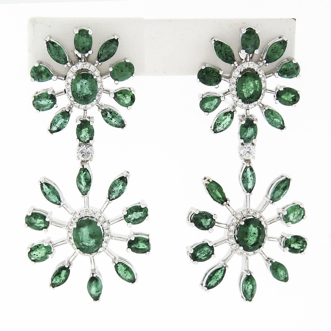 A solid 18k white gold drop dangle earrings, with 74 round cut natural diamonds (G/H - VS1/VS2 ; 0.48ctw), and 44 oval marquise & pear cut natrual emeralds (7.80ctw). The earrings measure approximately 47.75x21.6mm and weigh a total of 14.44 grams.