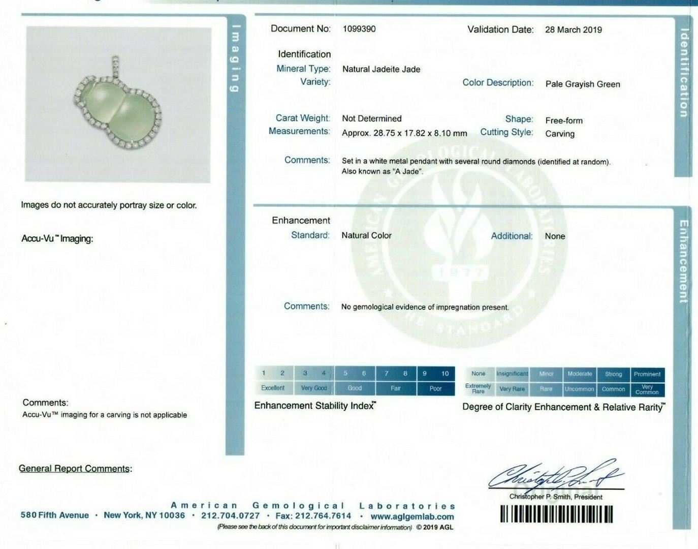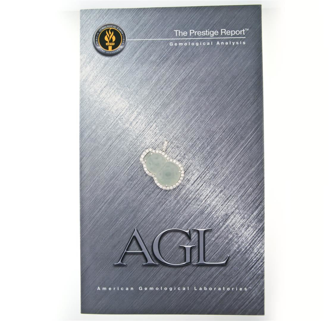 18k White Gold AGL Carved Grayish Green Jadeite Jade VS F 2.1ctw Diamond Pendant. A solid 18k white gold pendant featuring an AGL certified carved natural grayish-green jadeite (28.75x17.82x8.10mm) surrounded by 39 round brilliant cut natural diamonds (E/