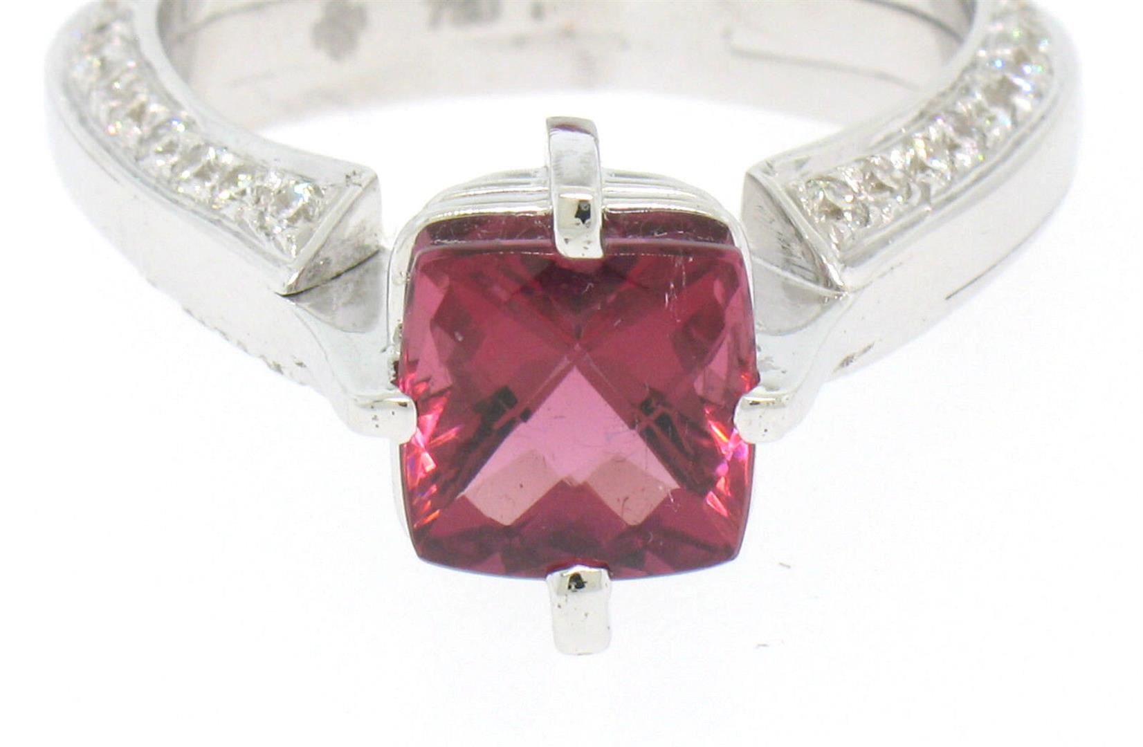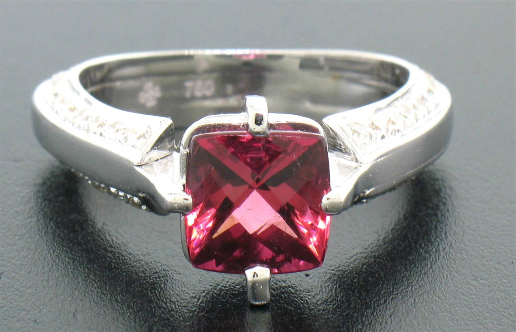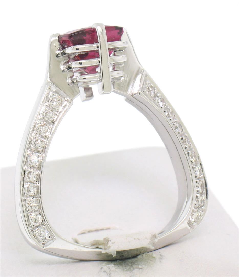 A new solid 18k white gold solitaire ring, featuring 1 cushion cut natural rubellite tourmaline (2.50ctw), accented with 40 round brilliant cut natural diamonds (F- VS2; 0.79ctw). The ring is size 8.0, weighs a total of 9.90 grams, and measures 5.57mm wide.