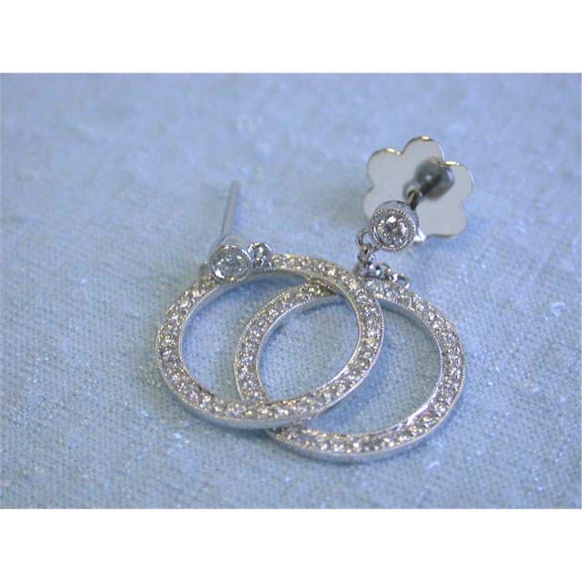 18k White Gold Earrings.  The earrings have Diamonds of 0.69 carat, G color and VS clarity.  The Earring's diameter is approximately 8.1 mm; Length is approximately 1 inch long; and Weight is 5.0 grams.