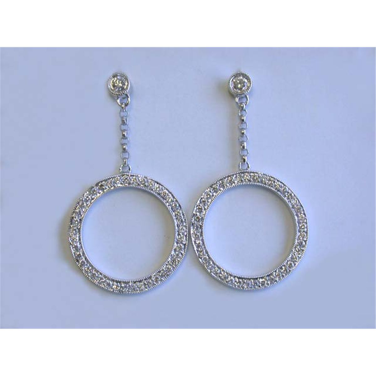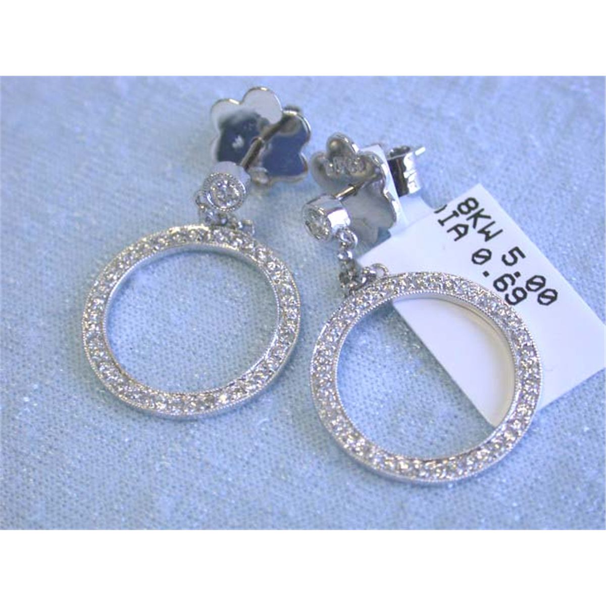 18k White Gold Earrings. The earrings have Diamonds of 0.69 carat, G color and VS clarity. The Earring's diameter is approximately 8.1 mm; Length is approximately 1 inch long; and Weight is 5.0 grams.