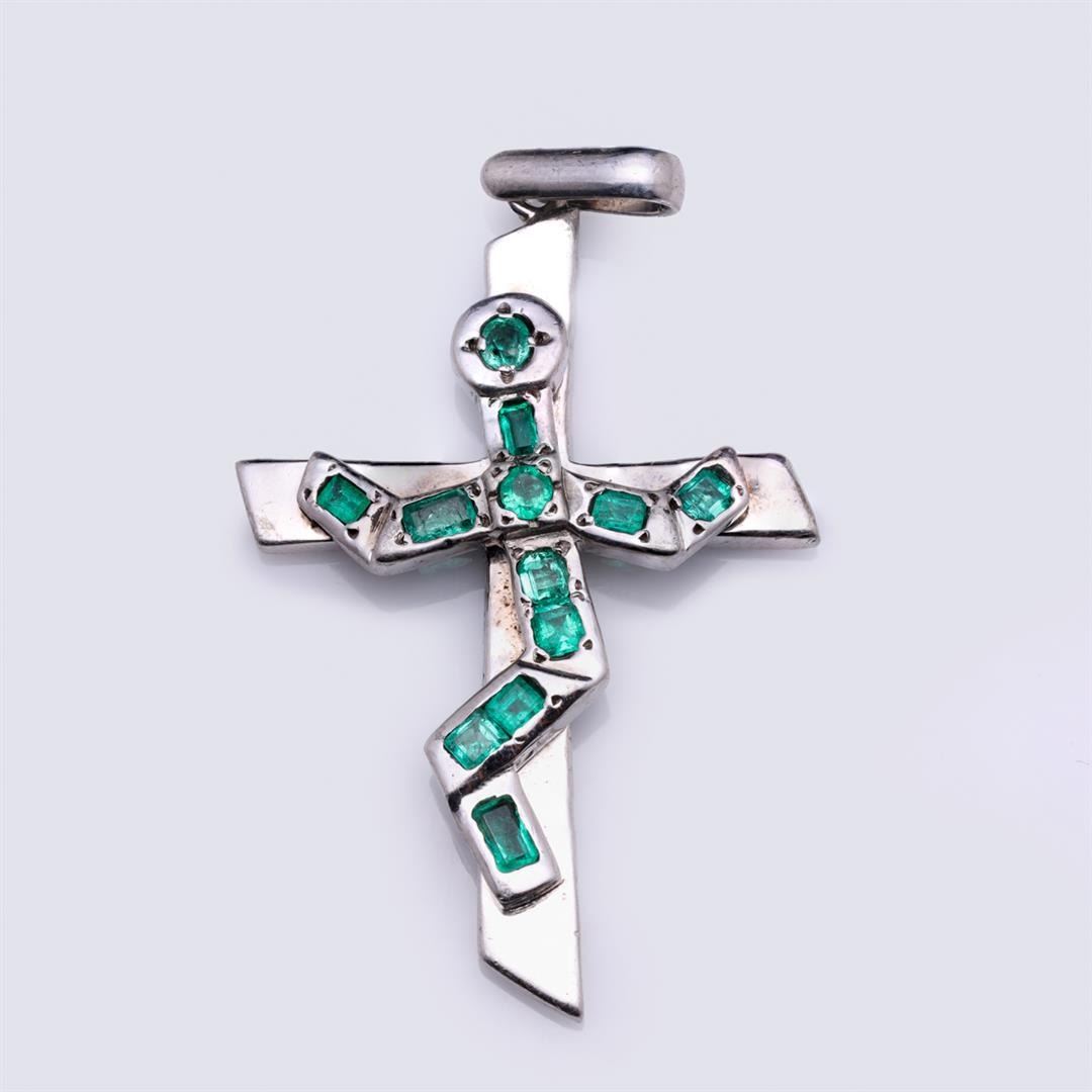 18k White Gold & Emerald Abstract Cross by Fernando Hernandez containing twelve emeralds weighing approximately 2.0 cts. Total weight is 12.6 gm. Estimated retail value $2,890.