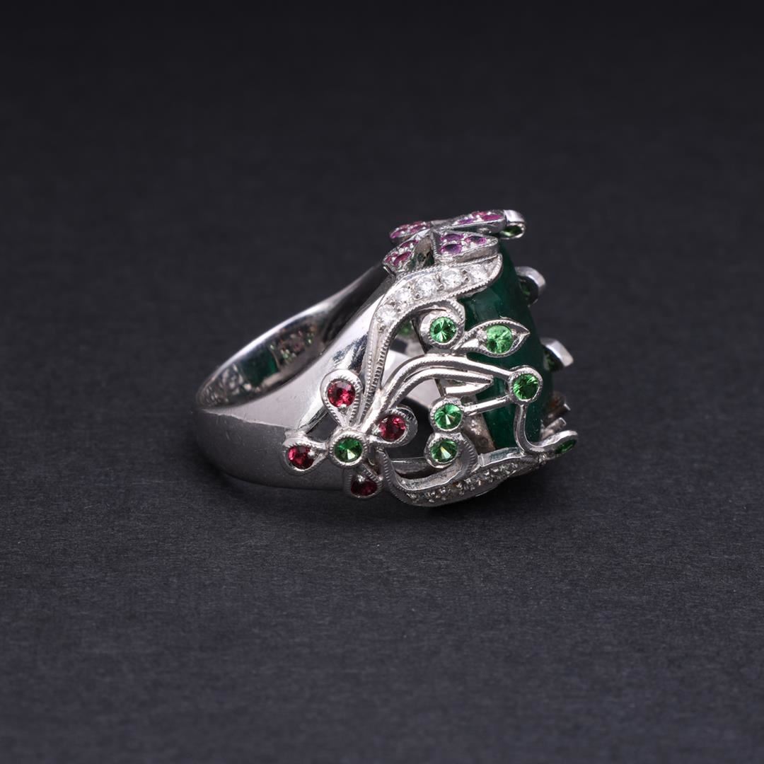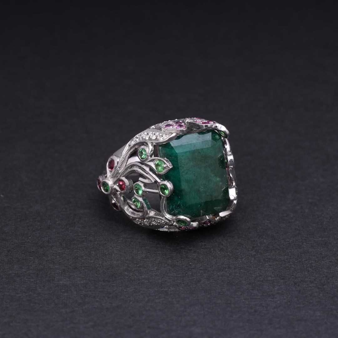 18k White Gold Emerald & Multi stone Cocktail Ring by Victor Loo containing one emerald cut emerald 15mm x 12mm weighing approximately 10 cts. Total weight of ring is 17 gm. Estimated retail value $8,400.