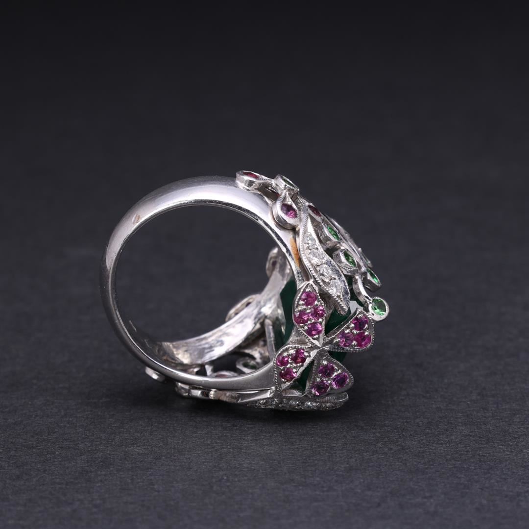 18k White Gold Emerald & Multi stone Cocktail Ring by Victor Loo containing one emerald cut emerald 15mm x 12mm weighing approximately 10 cts. Total weight of ring is 17 gm. Estimated retail value $8,400.