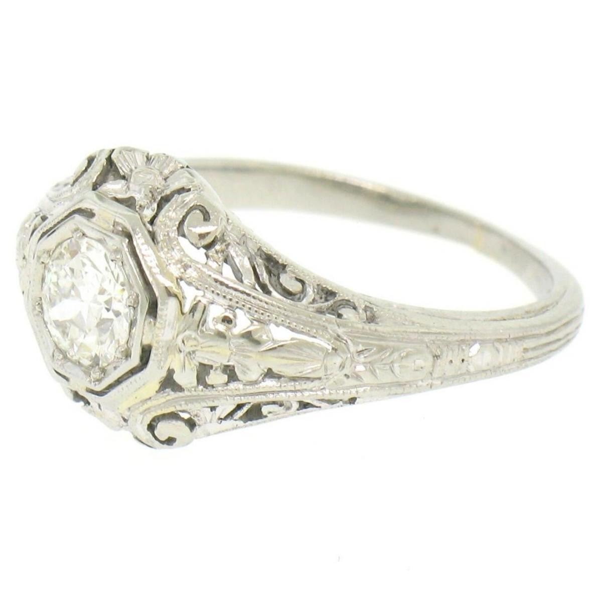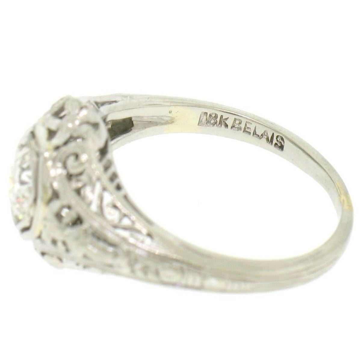 One Antique Art Deco Belais 18k White Gold Filigree 0.41ct European Cut Diamond Ring. Item Details: Material: 18K Solid White Gold, Weight: 2.6 Grams, Stone(s): (1) Natural Genuine Diamond - Old European Cut - Bead Set - E Color - VVS2 Clarity - 0.41ct (approx.), Ring Size: 4.0 (We can custom size this ring.), Ring Width: 9.90mm, Ring Height: 5.21mm rise off the finger, Condition: Antique ring in ALL ORIGINAL, MINT condition!, Signature: 18K Belais