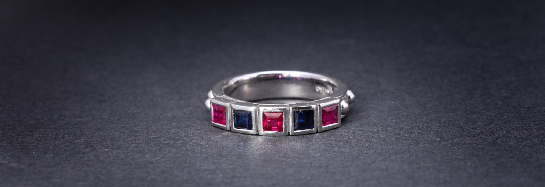 A rare 18k white gold designer half loop eternity ring by Carlo Rici, from a limited 1990s design, bezel set on top with five square set rubies and sapphires, each of good color, the shank decorated overall with round gold beads within a linier border, th