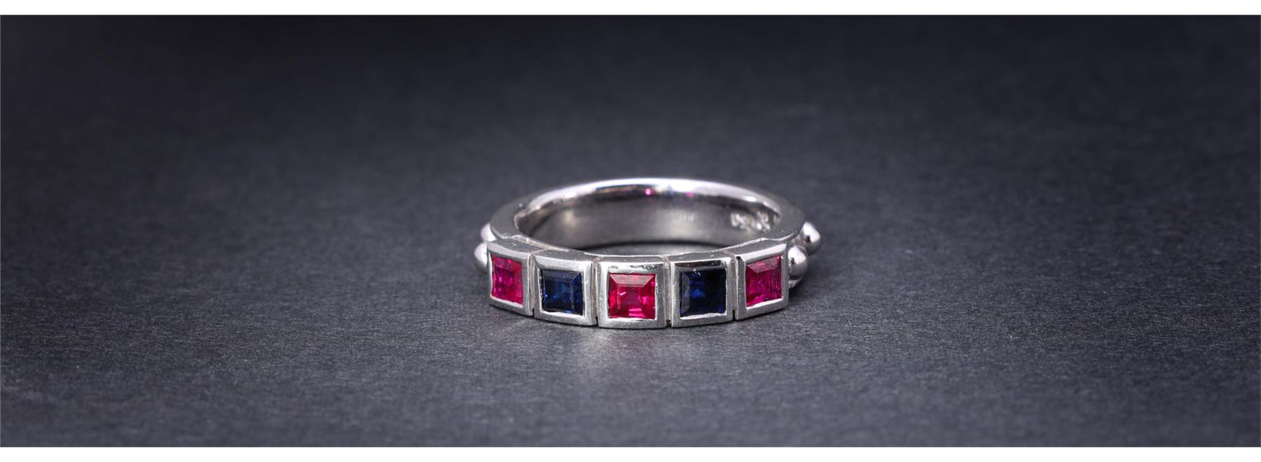 18k White Gold Half Loop Eternity Ring by Carlo Rici containing three square cut ruby weighing approximately 0.70 cts and two blue sapphire weighing approximately 0.42 cts Total weight is 6.6 gm. Estimated retail value $2,250.