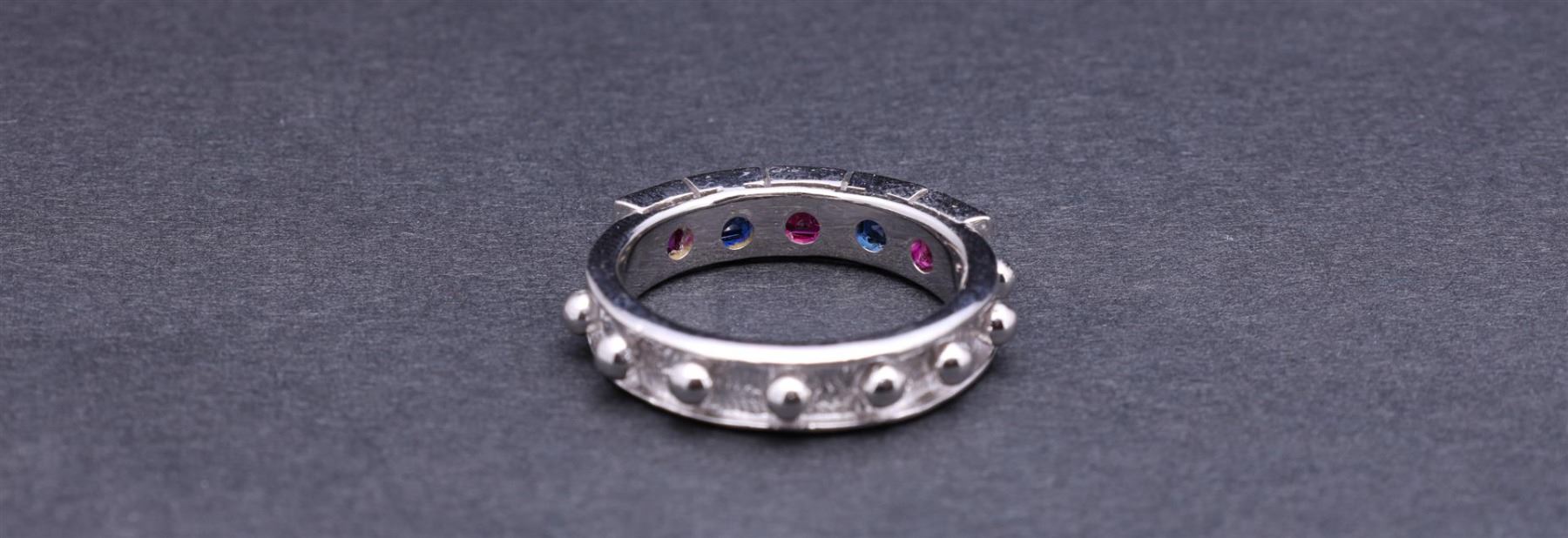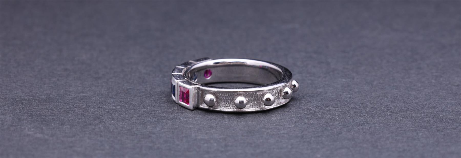 18k White Gold Half Loop Eternity Ring by Carlo Rici containing three square cut ruby weighing approximately 0.70 cts and two blue sapphire weighing approximately 0.42 cts Total weight is 6.6 gm. Estimated retail value $2,250.