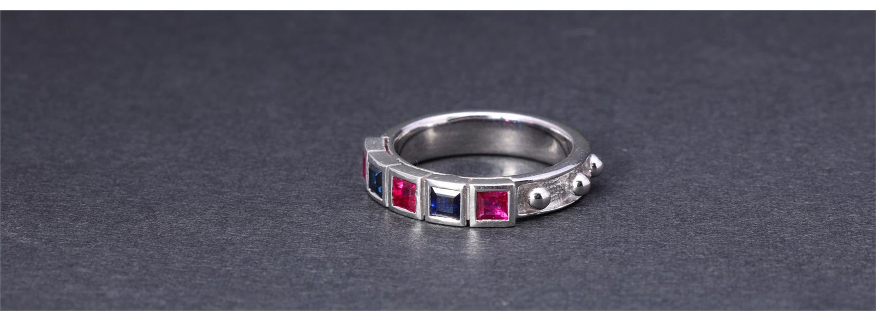 18k White Gold Half Loop Eternity Ring by Carlo Rici containing three square cut ruby weighing approximately 0.70 cts and two blue sapphire weighing approximately 0.42 cts Total weight is 6.6 gm. Estimated retail value $2,250.