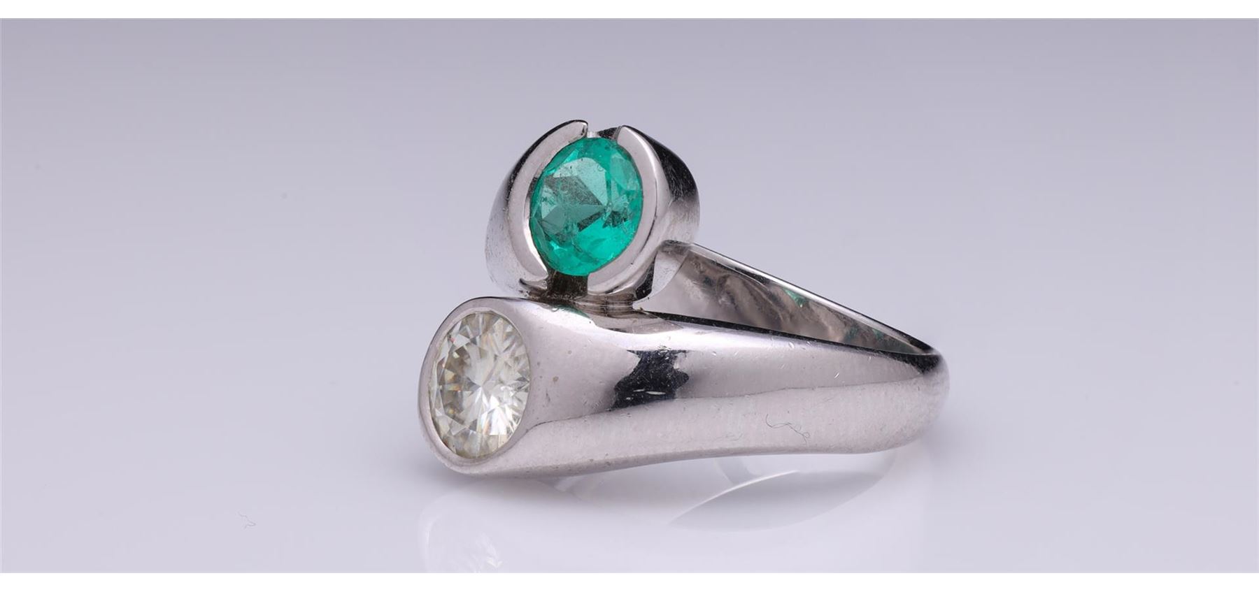 18k white gold crossover ring by Carlo Rici, a round cut bezel set moissanite twinned with a similar sized bright green emerald in split bezel setting, marked CR750; gross weight 12.4 g, size 7