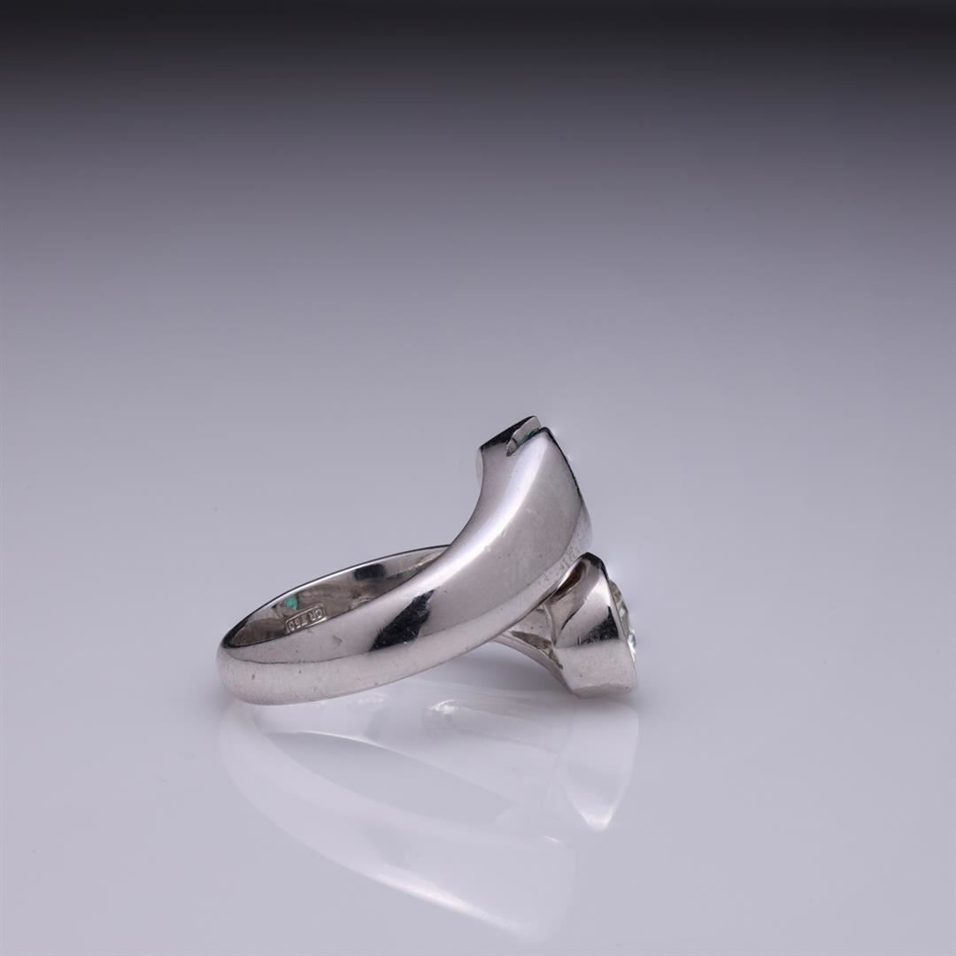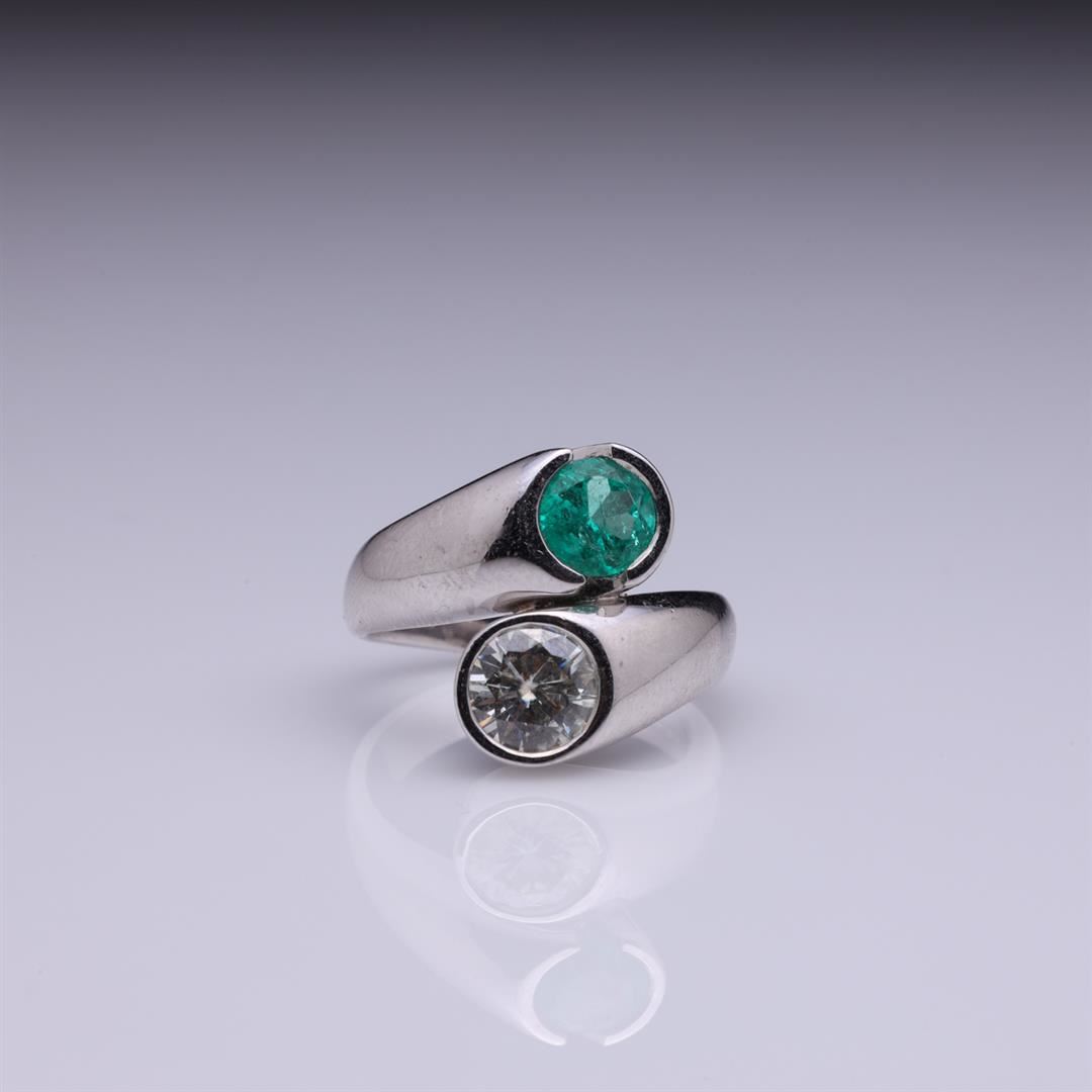 18k White Gold Moissanite & Emerald Crossover Ring by Carlo Rici containing one round moissanite weighing approximately 1.0 cts. One round cut emerald weighing approximately 1.0 cts. Total weight of ring is 12.5 gm. Estimated retail value $5,500.