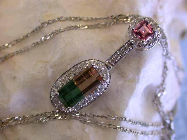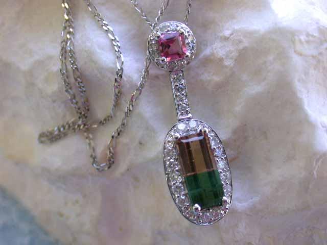 18k White Gold Necklace w/ Tourmaline about 1.74 carats & 0.39 carat Diamonds. Weight is 3.60 grams.