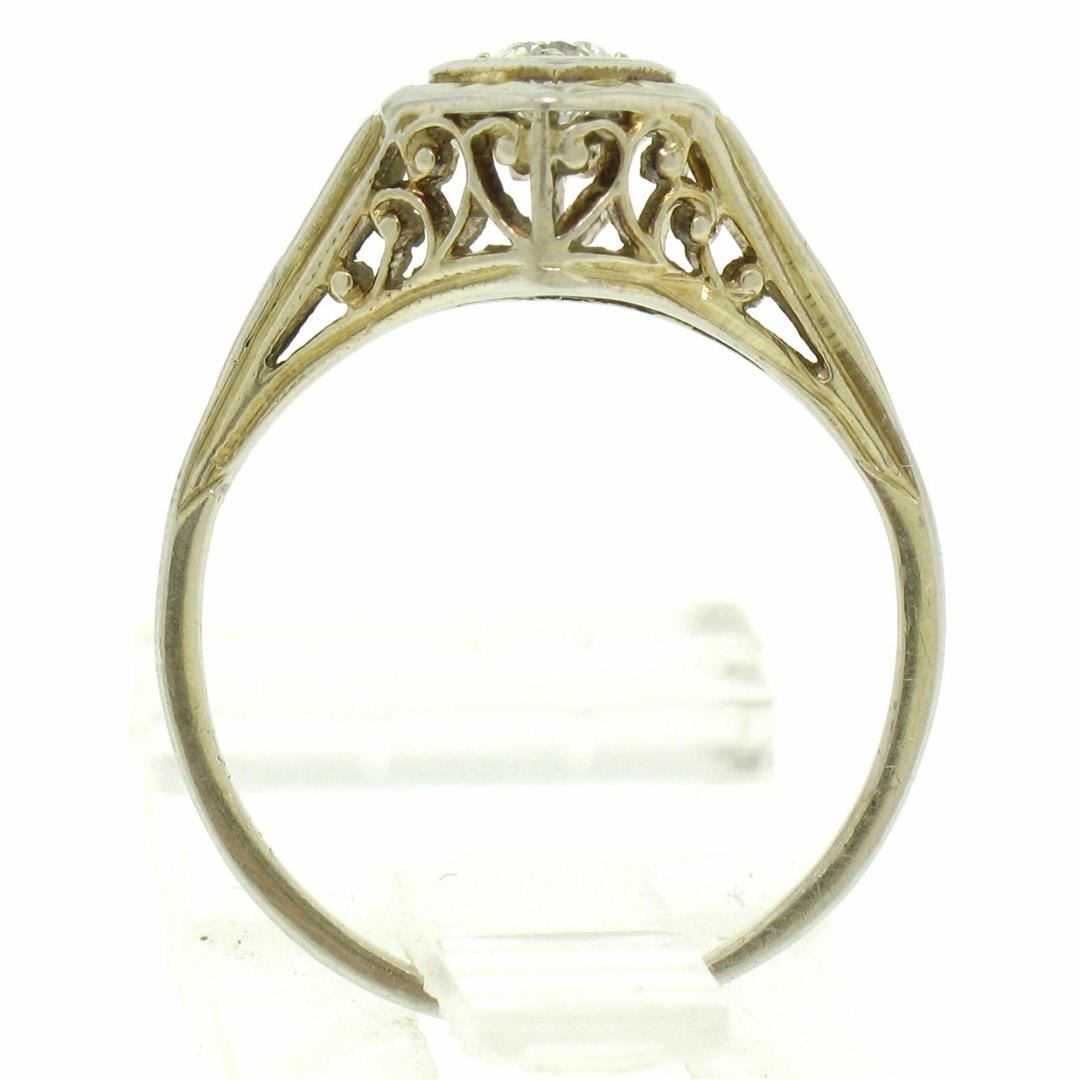 One Antique Art Deco Filigree 18k White Gold Old European Diamond Solitaire Ring. Item Details: Material: 18K Solid White Gold, Weight: 2.0 Grams, Stone(s): (1) Natural Genuine Diamond - Old European Cut - Bead Set - G Color - VS2 Clarity, Total Carat Weight: 0.24 (approx.), Ring Size: 6.0 (We can custom size this ring.), Ring Width: 8.8mm, Ring Height: 6.2mm rise off the finger, Condition: Antique ring. Excellent condition, ready to wear!