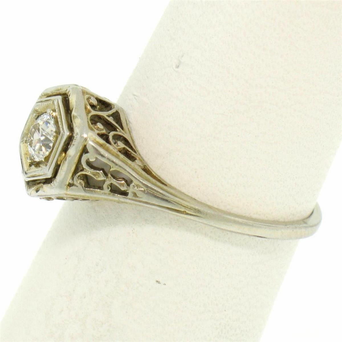 One Antique Art Deco Filigree 18k White Gold Old European Diamond Solitaire Ring. Item Details: Material: 18K Solid White Gold, Weight: 2.0 Grams, Stone(s): (1) Natural Genuine Diamond - Old European Cut - Bead Set - G Color - VS2 Clarity, Total Carat Weight: 0.24 (approx.), Ring Size: 6.0 (We can custom size this ring.), Ring Width: 8.8mm, Ring Height: 6.2mm rise off the finger, Condition: Antique ring. Excellent condition, ready to wear!