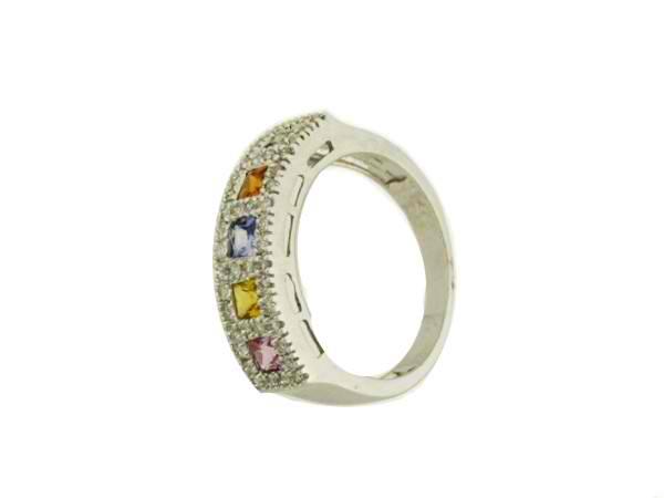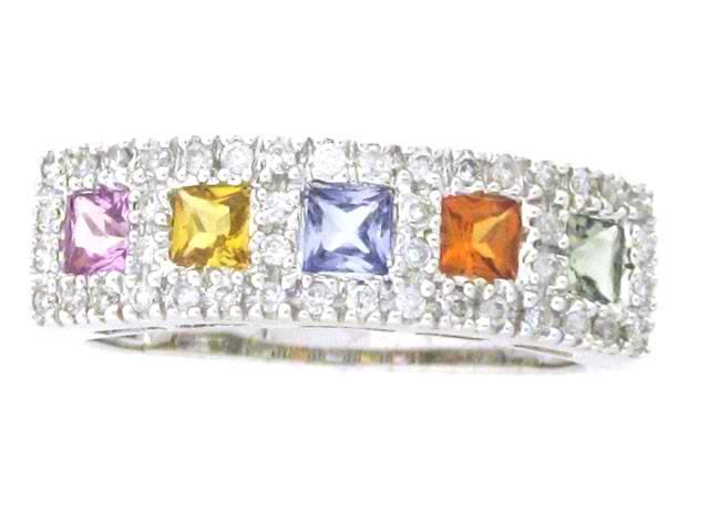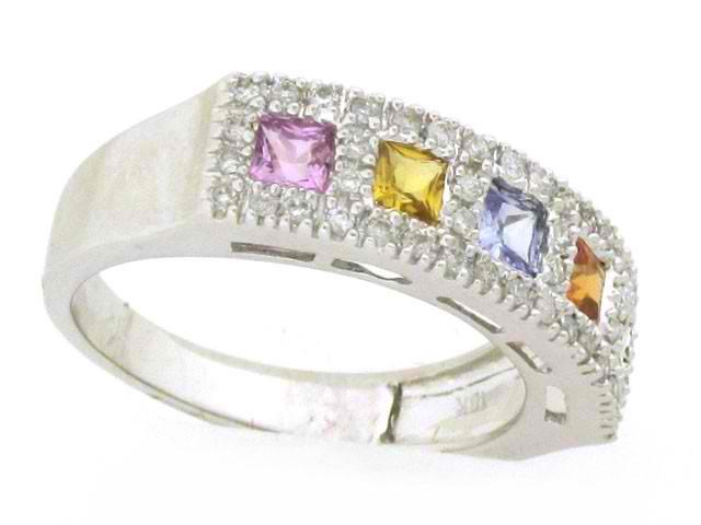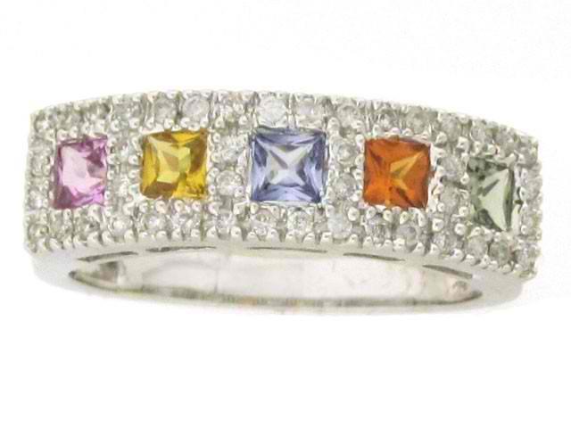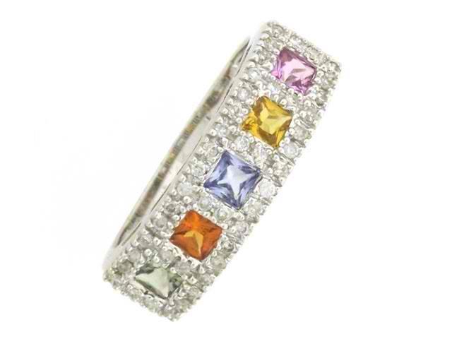 18k White Gold Ring w/ Diamonds - 0.24 carat, 44 pieces, G color and VS clarity and Multi-colored Gemstones - 0.70 carat. The ring size - 6.5 and weighs 4.35 grams