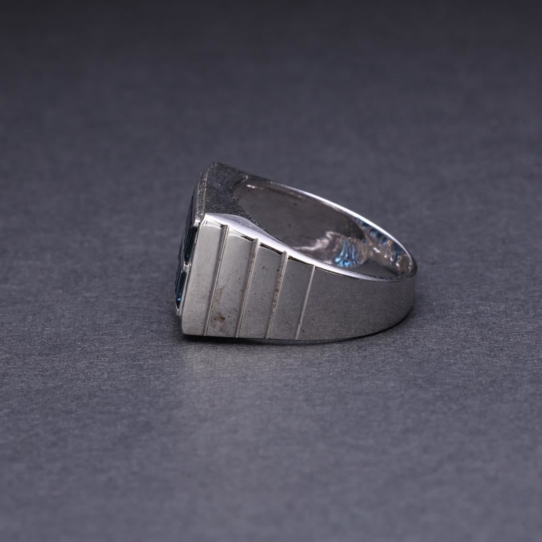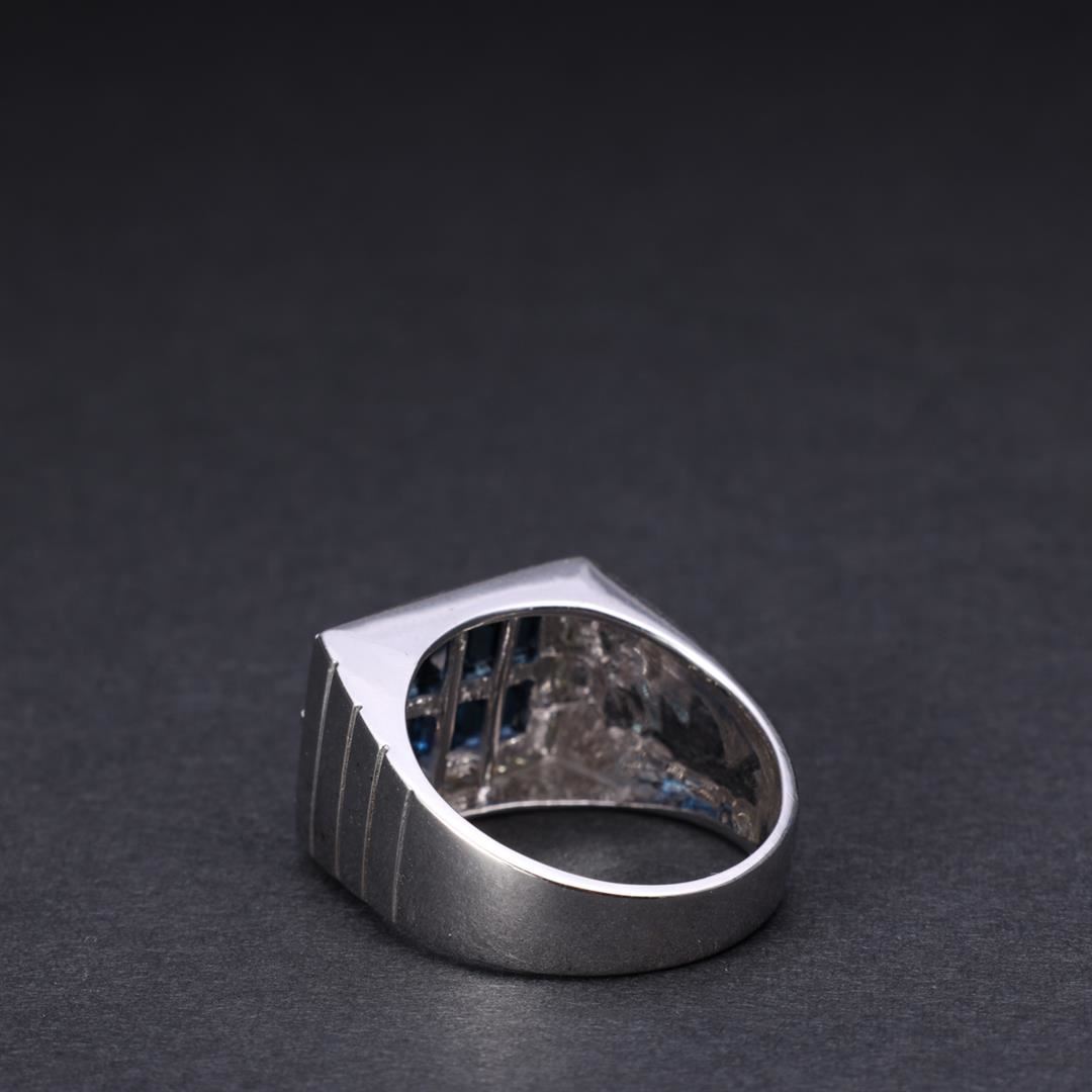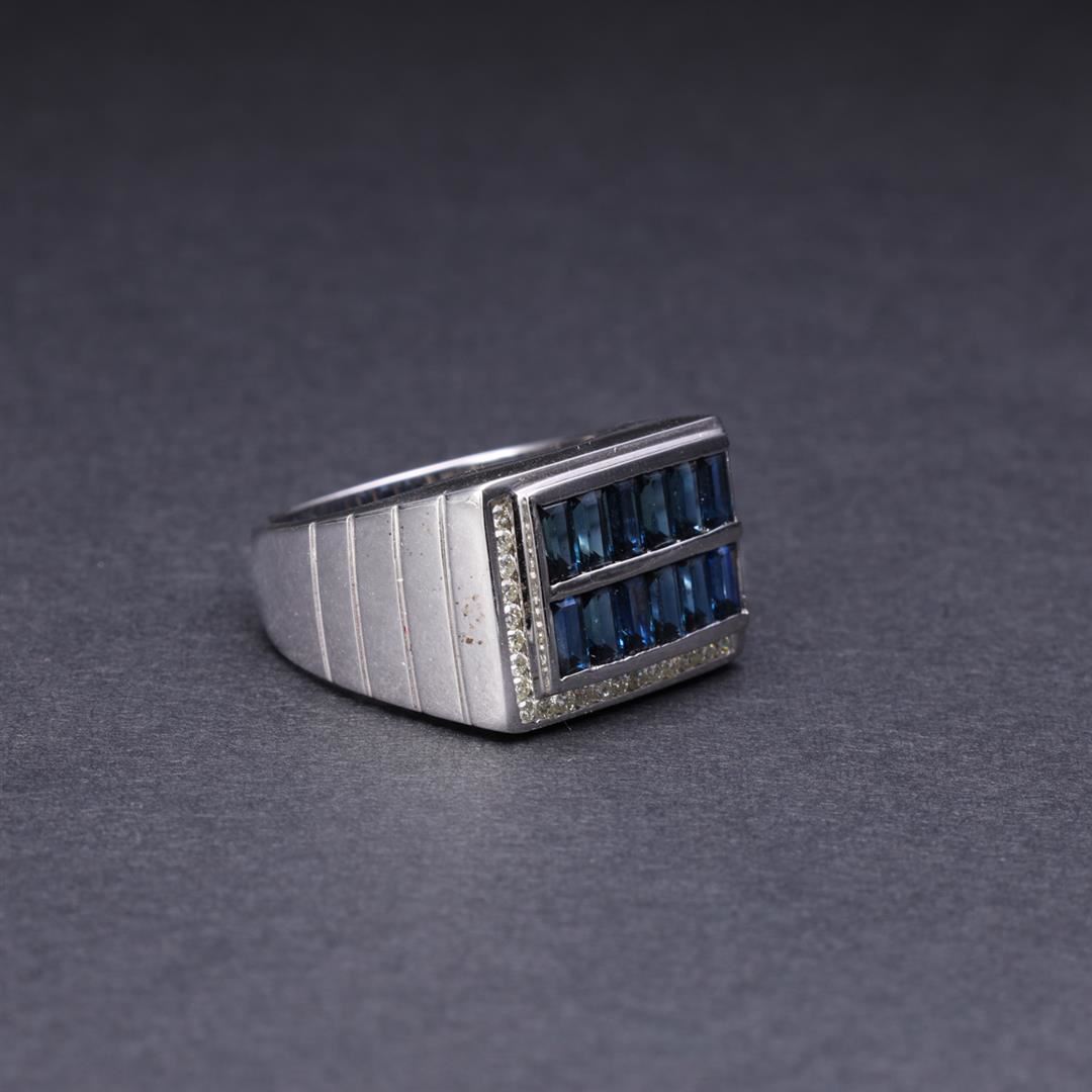 18k White Gold Sapphire & Diamond Ring containing twelve baguette cut sapphires weighing approximately 2.00 cts. Twenty round brilliant diamonds weighting approximately 0.20 cts. Total weight of ring is 11 gm. Estimated retail value $4,700.