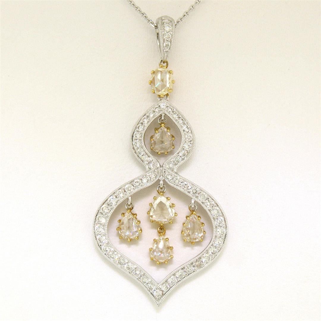 A like new 18k gold pendant featuring 0.70ctw of round diamonds (F - VS1/VS2) pave set into white gold and 1.40ctw of rose cut diamonds (Faint Yellow/Fancy Light Yellow - VS1/VS2) prong set into yellow gold. 18k white gold 18 inch cable link chain, 7.04 grams total weight, measures 38.88x22.36mm.